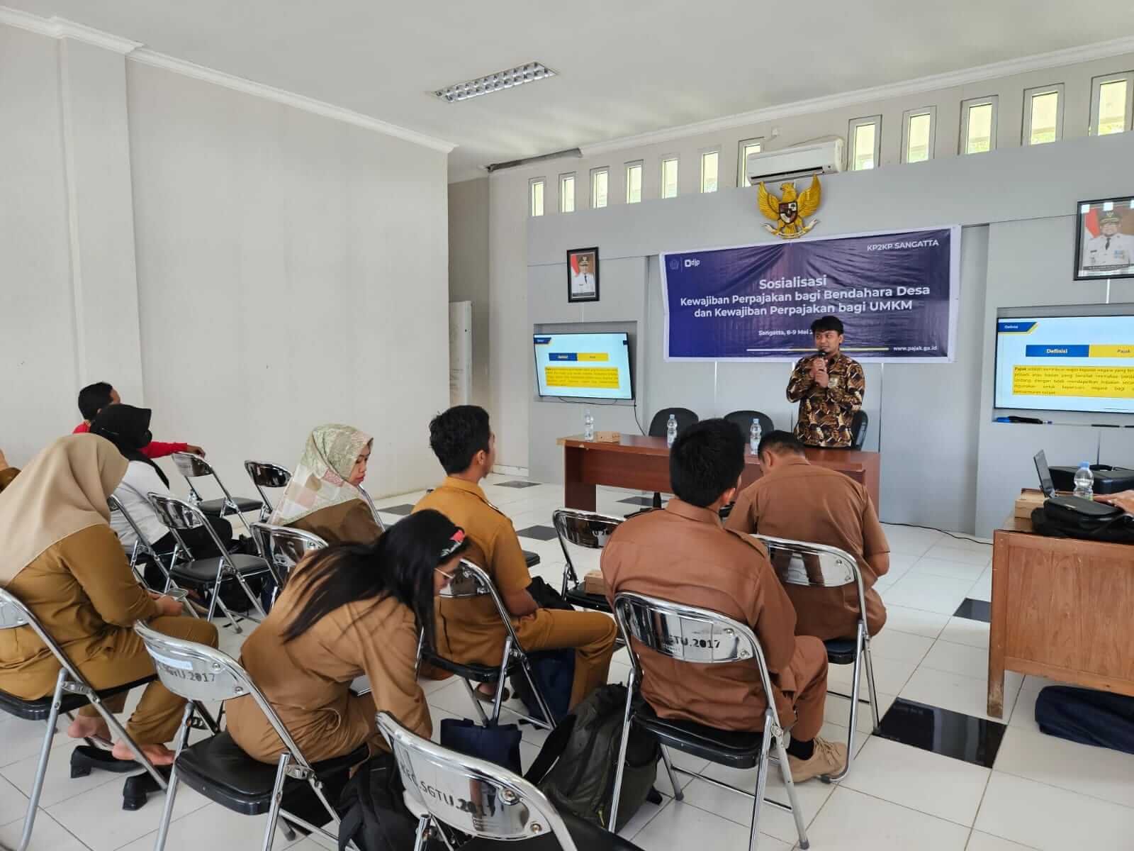 Kantor Pelayanan Pajak (KPP) Pratama Bontang menjadi narasumber di acara Sosialisasi Hak dan Kewajiban Bendaharawan Desa dan e-Bupot Unifikasi khususnya bagi bendahara desa di Kecamatan Sangatta Utara dan Sangatta Selatan yang diadakan oleh Kantor Pelayanan, Penyuluhan, dan Konsultasi Perpajakan (KP2KP) Sangatta di Kantor Desa Sangatta Utara, Kab. Kutai Timur (Selasa, 9/5). Jumlah peserta yang hadir mengikuti kelas pajak ini sebanyak 16 peserta yang merupakan perangkat desa yang ada di dua kecamatan di Kutai Timur.