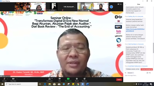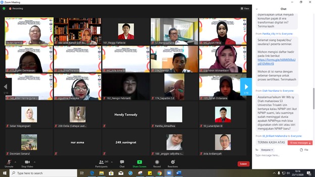 Kepala Seksi Kerja Sama dan Hubungan Masyarakat Kantor Wilayah DJP Banten mengisi webinar nasional yang diselenggarakan Tax Center Universitas Pembangunan Jaya di Serang, Banten (Senin, 23/11). Webinar ini diikuti oleh berbagai kalangan yaitu para mahasiswa, dosen, akuntan, konsultan pajak, dan auditor.