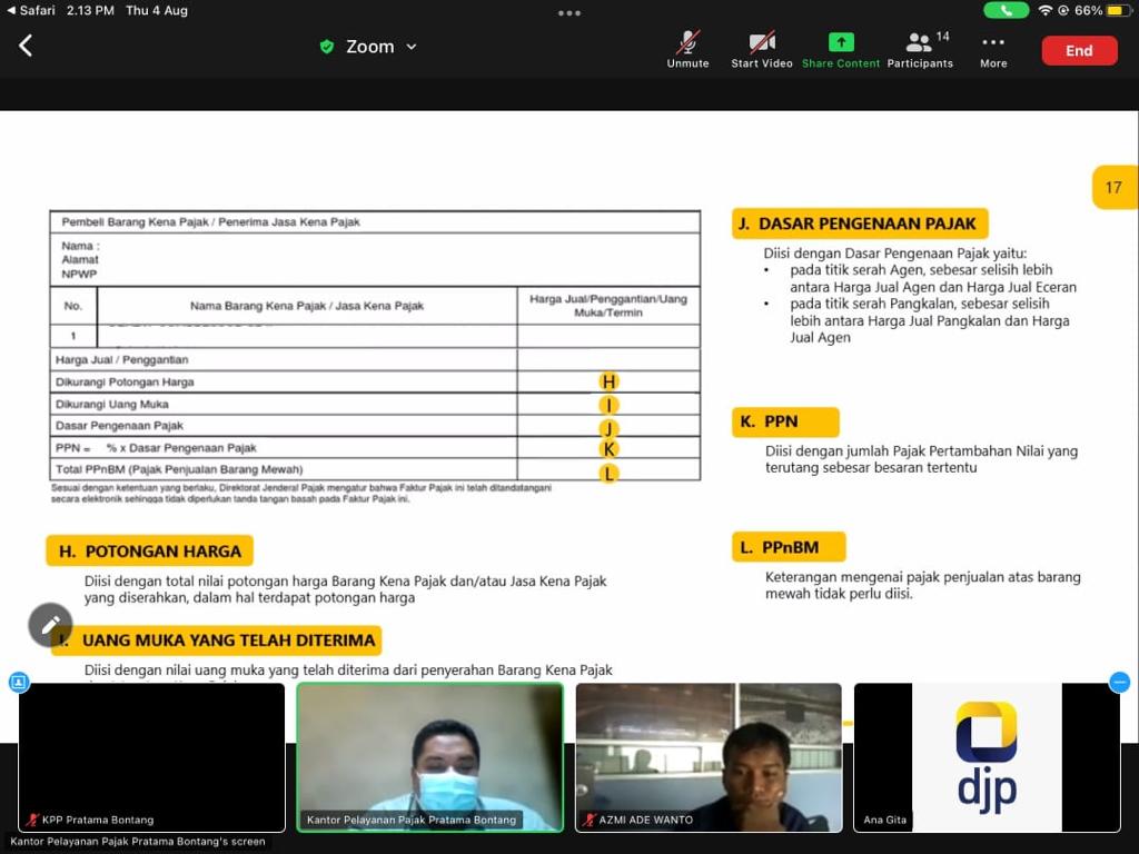 Kelas pajak kali ini diadakan secara daring melalui aplikasi Zoom Meeting dengan narasumber Fungsional Penyuluh Pajak Heryoni Ramadhani. Kelas pajak dimulai pada pukul 14.00 WITA sampai dengan selesai.