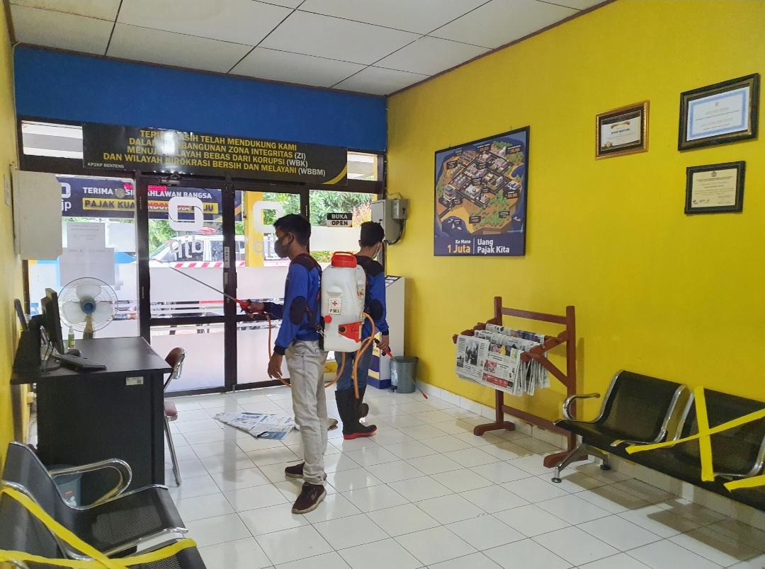 Kantor Pelayanan, Penyuluhan dan Konsultasi Perpajakan (KP2KP) Benteng bersama Palang Merah Indonesia (PMI) Kabupaten Kepulauan Selayar menyemprot disinfektan di KP2KP Benteng, Kepulauan Selayar, Sulawesi Selatan (Selasa, 19/1).