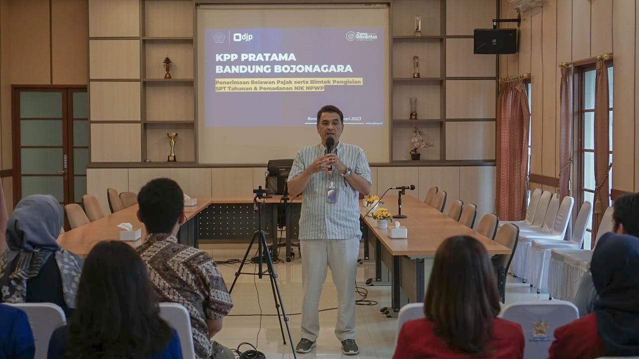 Kantor Pelayanan Pajak (KPP) Pratama Bandung Bojonagara memberikan pembekalan kepada 40 relawan pajak secara luring di Aula KPP Pratama Bandung Bojonagara, Jalan Terusan Prof. Dr. Sutami nomor 2, Kota Bandung (Kamis, 23/2). Kegiatan ini dilaksanakan untuk menyiapkan relawan pajak dalam tugas asistensi penyampaian Surat Pemberitahuan (SPT) Tahunan melalui e-Filing serta menyukseskan Pemadanan NIK- NPWP.
