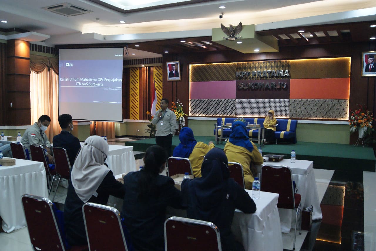 Kantor Pelayanan Pajak (KPP) Pratama Sukoharjo bekerja sama dengan Tax Center Institut Teknologi Bisnis (ITB) AAS Indonesia menyelenggarakan kuliah umum perpajakan di aula KPP Pratama Sukoharjo (Kamis, 10/11).
