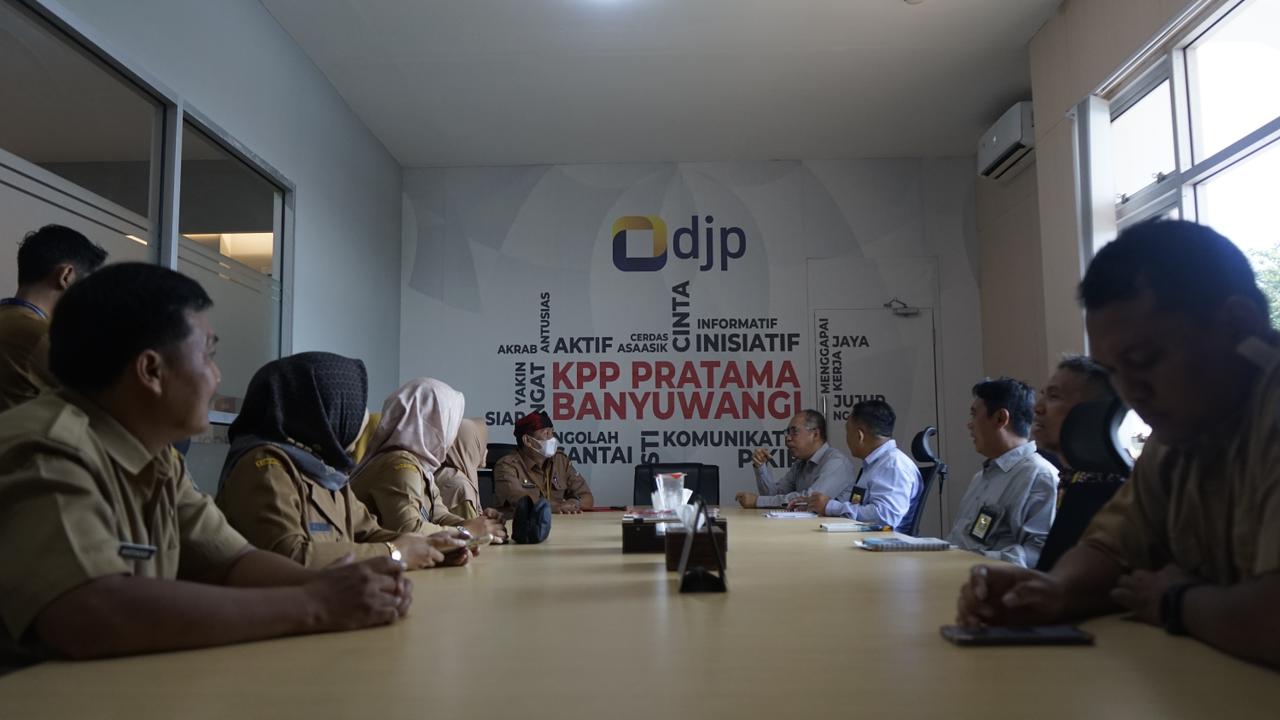 Kepala Kantor Pelayanan Pajak (KPP) Pratama Banyuwangi Ahmad Fudholi dan Pejabat Pelaksana Tugas (Plt) Kepala Bapenda Banyuwangi Firman Santoso bertemu di Aula KPP Pratama Banyuwangi, Jalan Adisucipto Nomor 27, Kecamatan Banyuwangi, Kabupaten Banyuwangi, Jawa Timur (Selasa, 9/1). Agenda pertemuan ini untuk kembali menjalin sinergi setelah kedua kantor saling bekerja sama dan keduanya berhasil mencapai target penerimaan tahun 2023.