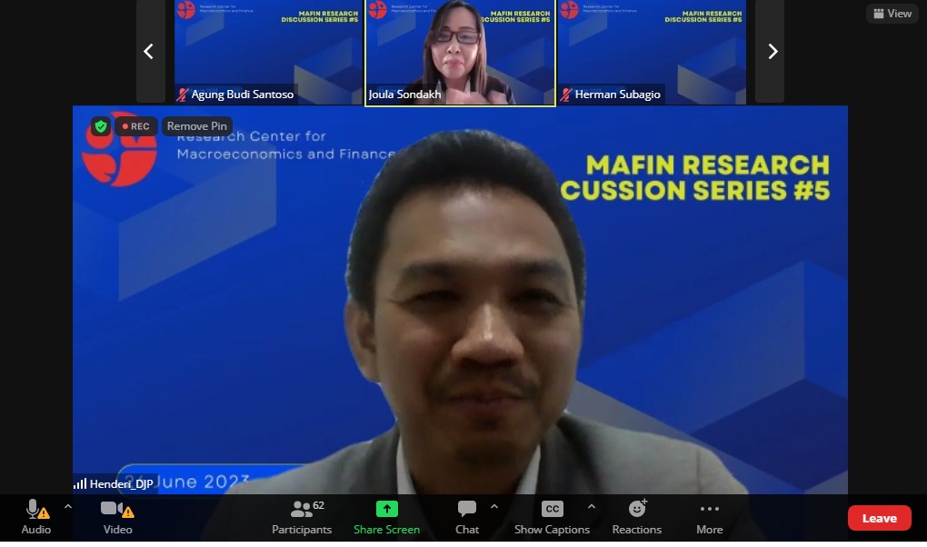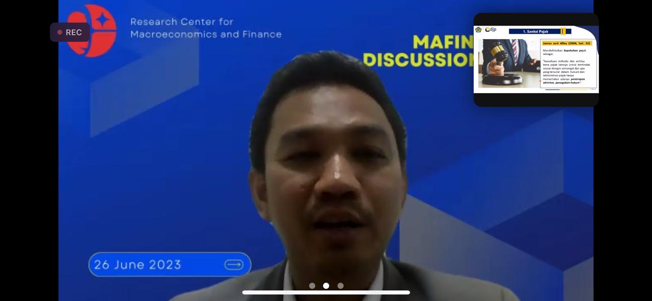 Kantor Pelayanan Pajak (KPP) Madya Palembang berkesempatan menjadi discussant (pembahas) dalam acara Macroeconomic and Finance (MAFIN) Research Discussion yang diselenggarakan oleh Badan Riset Inovasi Nasional (BRIN) (Senin, 26/6). Pada kesempatan ini, Henderi, Kepala Seksi Pelayanan KPP Madya hadir sebagai pembahas.