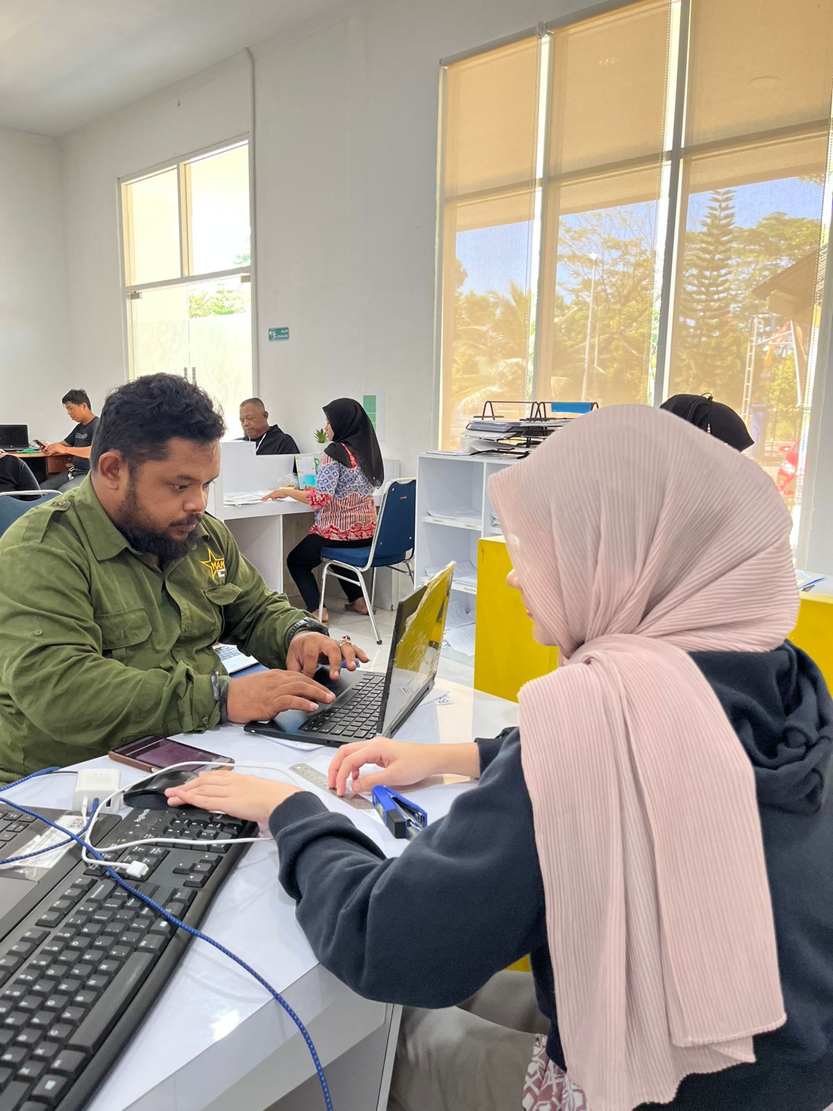 Direktur Samudra Alam Morowali (SAM), Nursam, mendatangi Loket Help Desk Kantor Pelayanan Pajak (KPP) Pratama Poso, Sulawesi Tengah (Jumat, 26/4). Kedatangan direktur tersebut untuk bertanya cara memasang aplikasi e-Faktur pada laptop perusahaan yang sudah berganti. Kedatangan Nursam disambut baik oleh Petugas Help Desk Nabella Putri Lestari. Nursam menjelaskan bahwa perusahaannya bergerak di bidang Penyediaan Tenaga Kerja Waktu Tertentu yang baru saja dikukuhkan sebagai Pengusaha Kena Pajak (PKP) pada awal tahun.