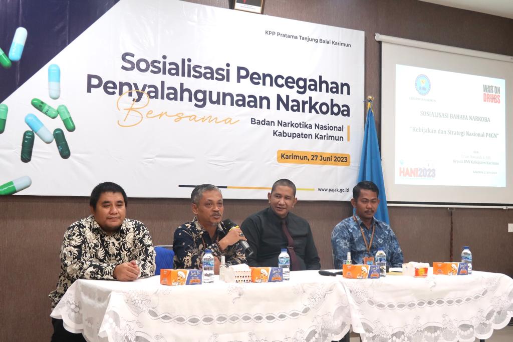KPP Pratama Tanjung Balai Karimun (TBK) mengundang Badan Narkotika Nasional (BNN) Kabupaten Karimun untuk menyelenggarakan tes narkoba dan sosialisasi pencegahan penyalahgunaan narkoba kepada pegawai KPP Pratama TBK yang diselenggarakan di Aula Berkarya KPP Pratama TBK, Kabupaten Karimun, Kepulauan Riau (Selasa, 27/6).
