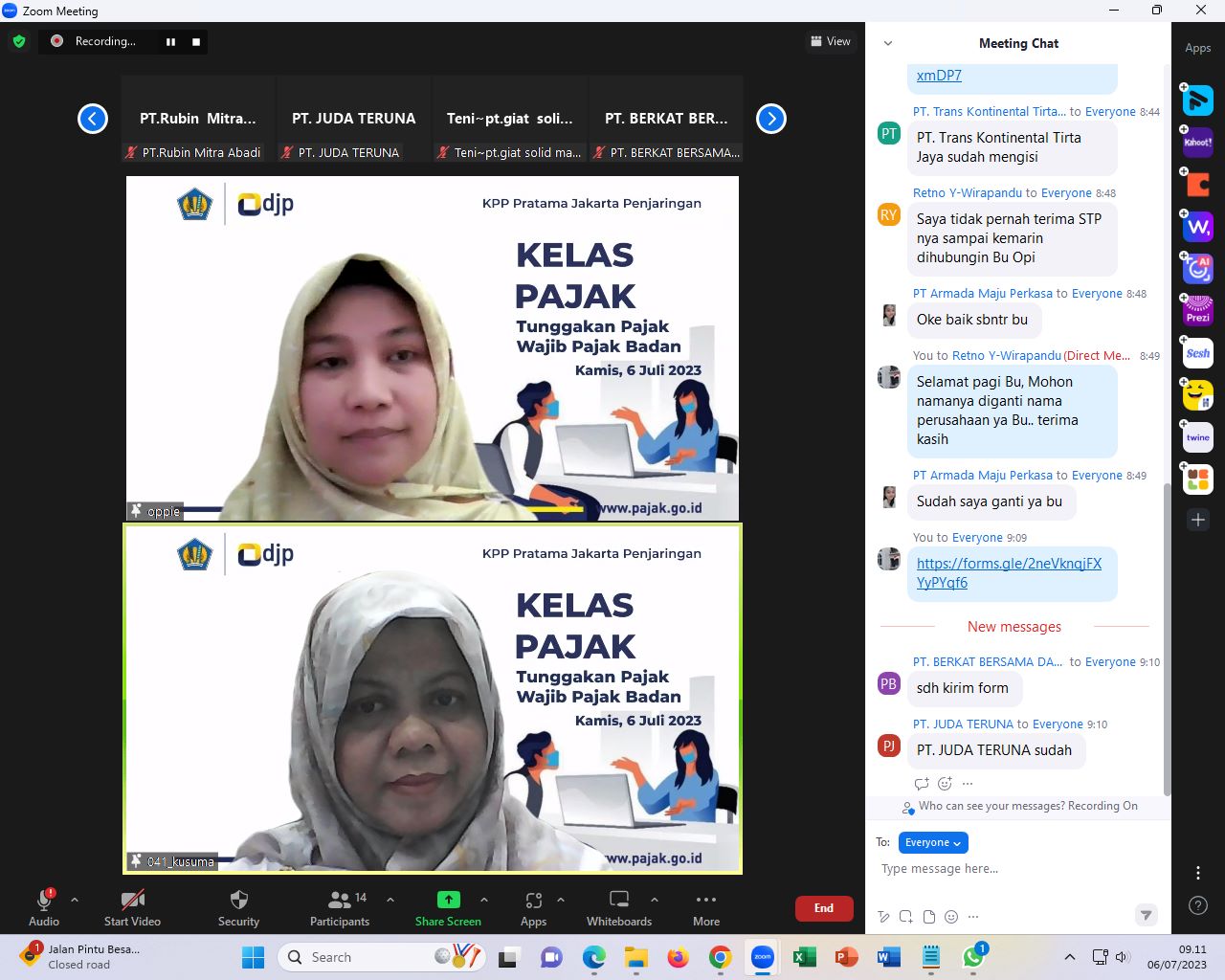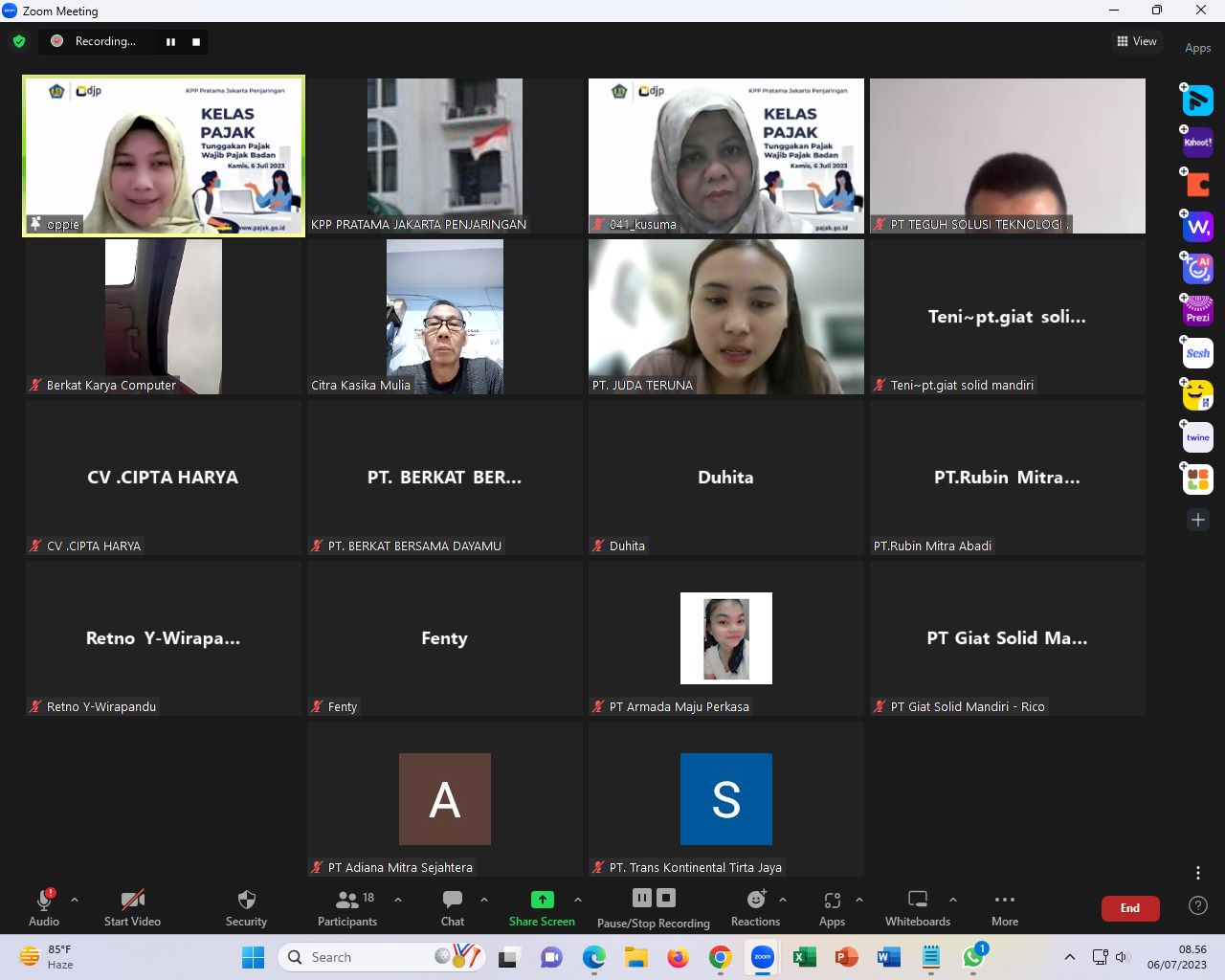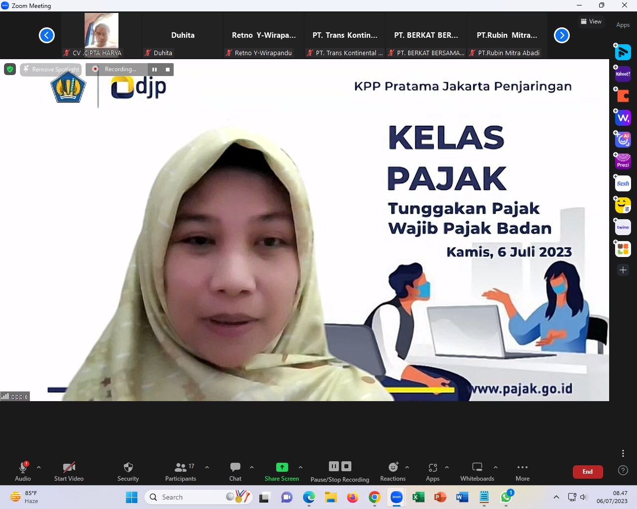 Kantor Pelayanan Pajak (KPP) Pratama Jakarta Penjaringan menyelenggarakan kelas pajak terkait tunggakan pajak, diikuti Wajib Pajak Badan Pengusaha Kena Pajak (PKP) secara online di Jakarta Barat (Kamis, 6/7). Kegiatan dilaksanakan pukul 09.00 sampai 11.00 WIB dengan pemateri Fungsional Penyuluh Pajak Mura Novia Nur Annisaq.