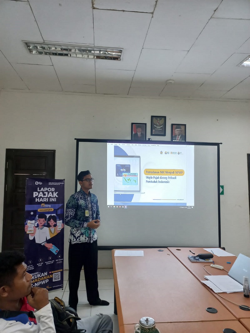 Afif, Asisten Fungsional Penyuluh Pajak, menginformasikan para peserta sosialisasi SPT tahunan karyawan dan memadanan NIK-NPWP mengenai konsultasi online KPP Pratama Bontang jika masih ada yang ingin ditanyakan di @pajakbontang pada semua sosial media.
