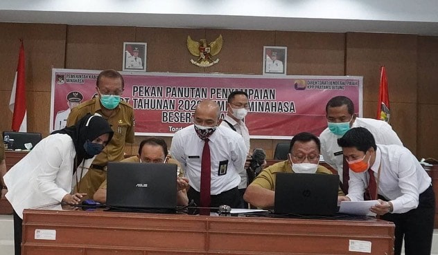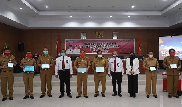 Bupati Minahasa Royke O. Roring bersama Wakil Bupati Minahasa Robby Dondokambey dan para asisten di lingkungan pemerintahan Kabupaten Minahasa melaporkan SPT Tahunan dengan menggunakan e-Filing pada kesempatan ini.