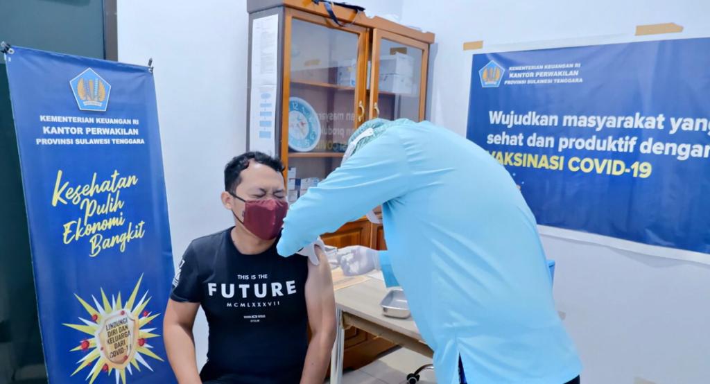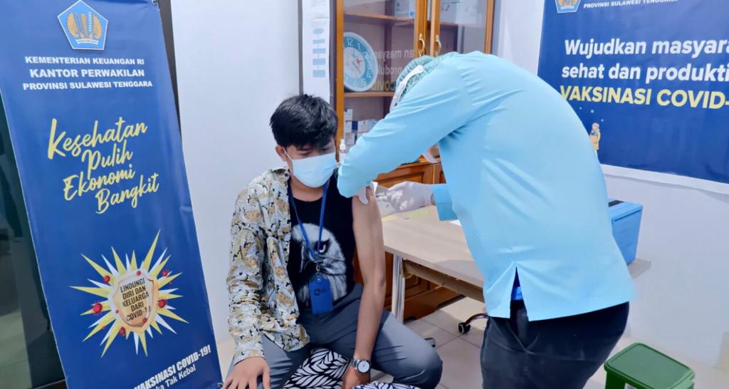 Kantor Pelayanan Pajak (KPP) Pratama Kolaka melaksanakan vaksinasi Covid-19 tahap pertama di Rumah Vaksin Kendari, Kendari, Sulawesi Tenggara (Selasa, 9/3). Sebelum menerima vaksin, para pegawai terlebih dahulu melakukan cek kesehatan, seperti pemeriksaan tekanan darah dan riwayat penyakit, untuk memastikan kondisi tubuh dalam keadaan siap disuntikkan vaksin.