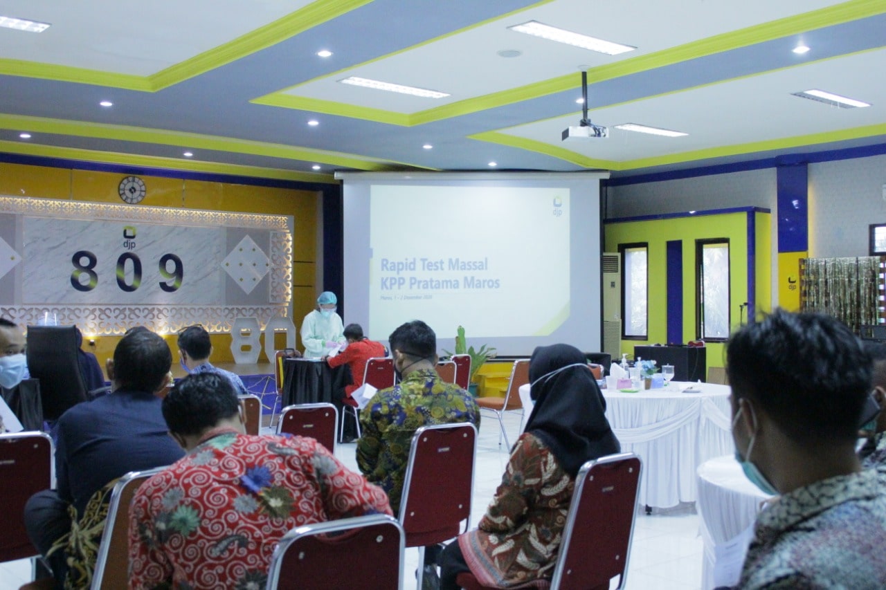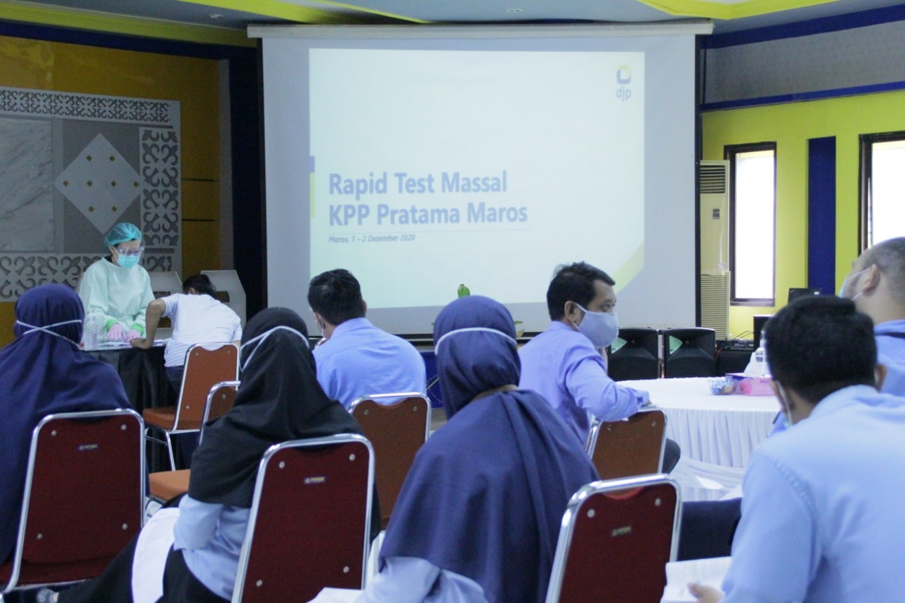 Kantor Pelayanan Pajak (KPP) Pratama Maros melakukan tes cepat (rapid test) serologi Covid-19 di ruang Lantai II Aula KPP Pratama Maros di Kabupaten Maros (Rabu, 2/12). Tes cepat ini dilakukan dilakukan untuk seluruh pegawai KPP Pratama Maros dan KP2KP Pangkajene, baik ASN maupun Pegawai Pemerintah Non Pegawai Negeri (PPNPN).