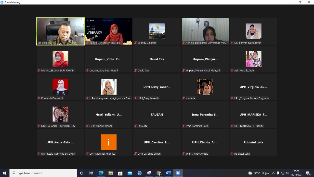 Kantor Wilayah Direktorat Jenderal Pajak (Kanwil DJP) Banten menggelar Club Literacy pertemuan ketiga bersama para pegawai, dosen, dan mahasiswa dari tax center di Lingkungan Kanwil DJP Banten dengan tema Pajak dari Berbagai Perspektif di Serang, Banten (Jumat, 15/10).