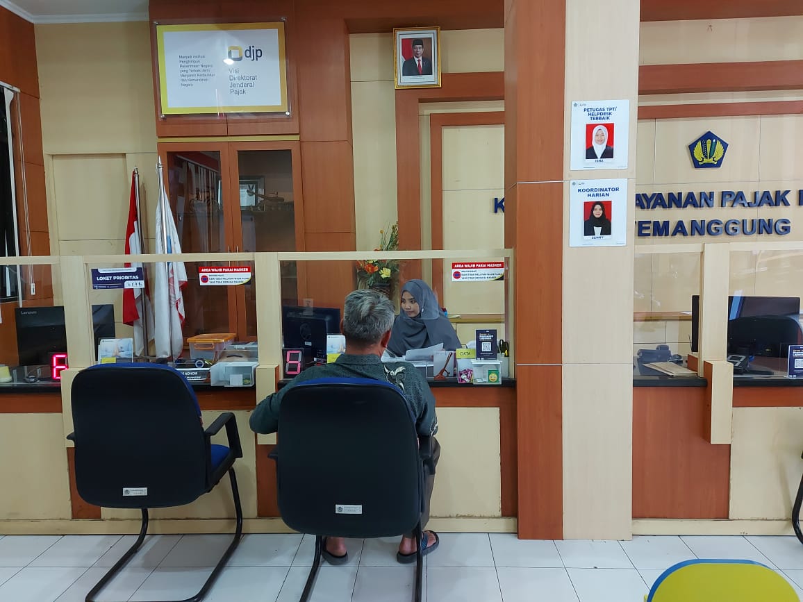 Oktaviana Eka Kusuma, selaku petugas loket Tempat Pelayanan Terpadu (TPT) KPP Pratama Temanggung menyambut kedatangan Sunaryo dan membantunya dalam proses pendaftaran NPWP.