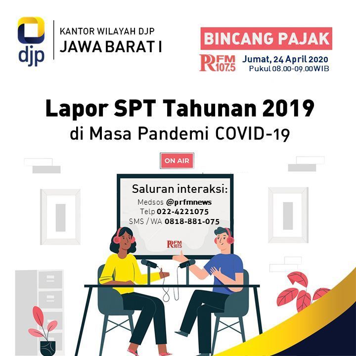 Kantor Wilayah DJP Jawa Barat I kembali mengudara dalam siaran langsung interaktif “Bincang Pajak” di Radio PRFM Bandung, (Jumat, 24/4). Kali ini, program rutin yang dipersembahkan oleh Kanwil DJP Jawa Barat I setiap Jumat dua minggu sekali ini membahas Relaksasi SPT Tahunan di masa Pandemi Covid-19.