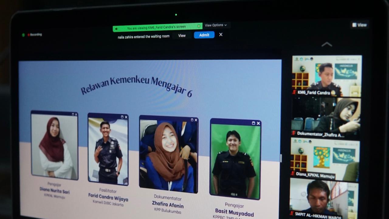 Melalui Zoom Meeting, bersama dengan satu orang relawan fasilitator yang berasal dari Kanwil Bea Cukai Jakarta dan dua orang relawan pengajar yang berasal dari KPKNL Mamuju dan KPPBC Nunukan, relawan dokumentator yang berasal dari KPP Pratama Bulukumba, membahas terkait Tugas Fungsi Kementerian Keuangan, Pengertian APBN serta Program Pemulihan Ekonomi Nasional atau biasa dikenal dengan istilah PEN.