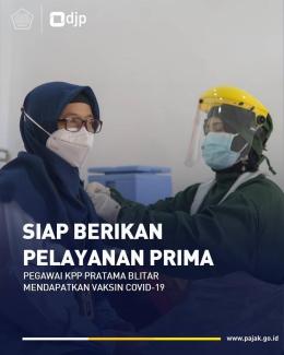 Sebagai bentuk ikhtiar untuk meningkatkan kualitas pelayanan kepada wajib pajak, Kantor Pelayanan Pajak (KPP) Pratama Blitar mendapatkan vaksin Covid-19 tahap pertama, Blitar (Rabu, 3/3). Pemberian vaksin Covid-19 ditujukan kepada seluruh pegawai organik dan non-organik KPP Pratama Blitar dan juga Kantor Pelayanan Penyuluhan dan Konsultasi Perpajakan (KP2KP) Wlingi.