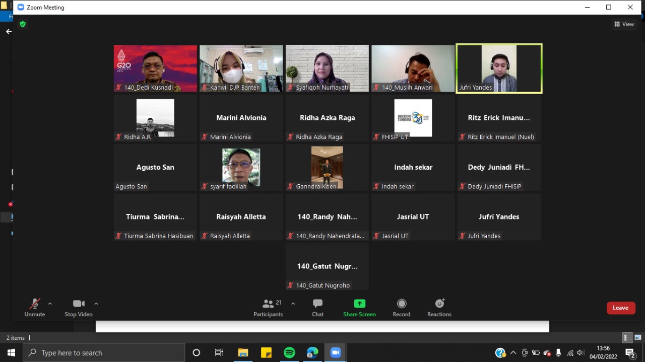 Kantor Wilayah DJP Banten bersama Tax Center Universitas Terbuka melakukan kegiatan pembekalan kepada relawan pajak secara daring melalui aplikasi zoom cloud meeting di Kota Serang, Banten (Jumat, 4/2). Kegiatan ini bertujuan untuk memberikan pembekalan kepada para relawan pajak sebelum terjun langsung melayani wajib pajak di Provinsi Banten, khususnya di Kota Tangerang Selatan.