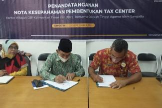Kepala Kantor Wilayah DJP Kalimantan Timur dan Utara Max Darmawan bersama Ketua Sekolah Tinggi Agama Islam (STAI) Sangatta Arif Rembang Supu melakukan penandatanganan Nota Kesepahaman/Memorandum of Understanding (MoU) pembentukan tax center secara langsung di gedung STAI Sangatta, Kabupaten Kutai Timur (Jumat, 23/9). Hal ini merupakan komitmen DJP untuk meningkatkan kesadaran pajak sejak dini kepada generasi muda.