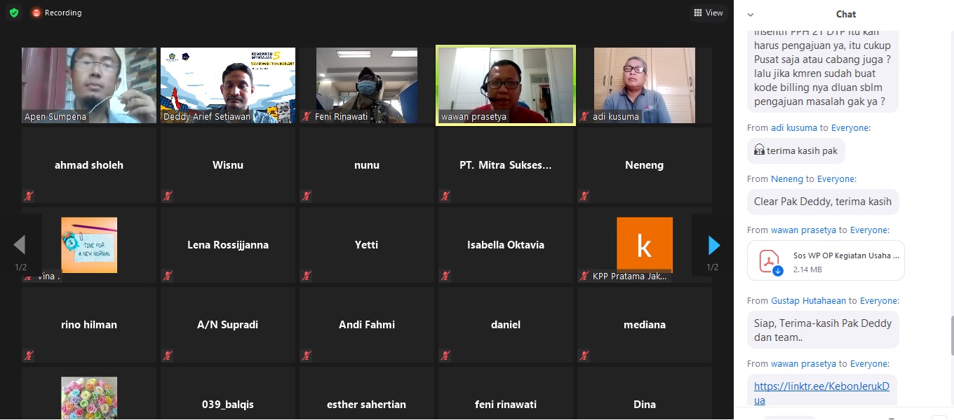 Direktorat Jenderal Pajak (DJP) melalui Kantor Pelayanan Pajak (KPP) Pratama Kebon Jeruk Dua menyelenggarakan edukasi dan penyuluhan Tata Cara Pengisian dan Penyampaian SPT Tahunan 1770, 1770 S, dan 1770 SS kepada Wajib Pajak Orang Pribadi melalui media Zoom Meeting di Jakarta (Kamis, 11/2).