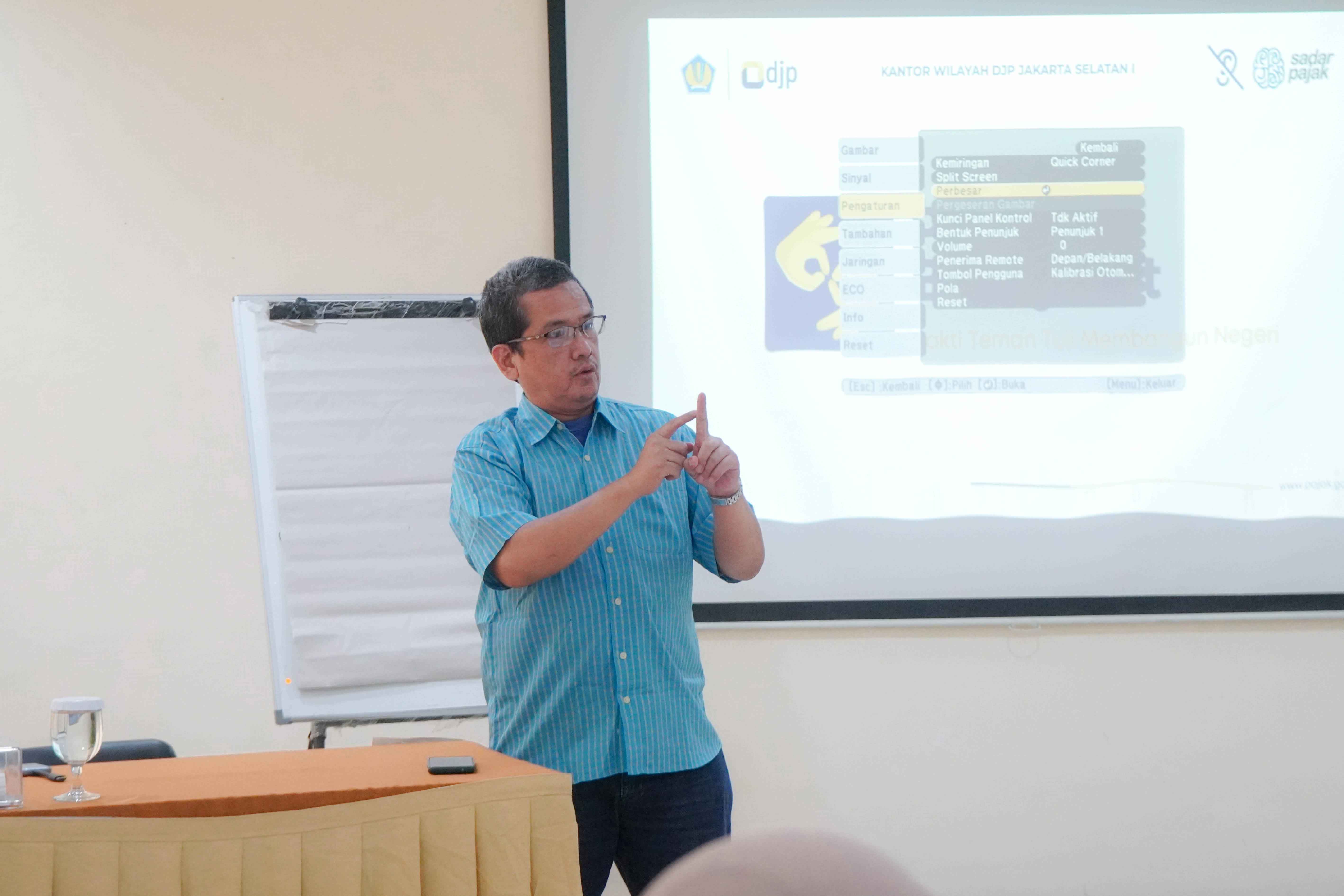 Kantor Wilayah Direktorat Jenderal Pajak (Kanwil DJP) Jakarta Selatan I, bekerja sama dengan Komunitas Gerakan untuk Kesejahteraan Tuna Rungu Indonesia (Gerkatin), mengadakan kegiatan Pajak Berisyarat bersama teman-teman tuli di Ruang Serbaguna D101 Gedung D Haryono Sumusdirdjo, BPPK Purnawarman, Kota Administrasi Jakarta Selatan (Selasa, 15/8).