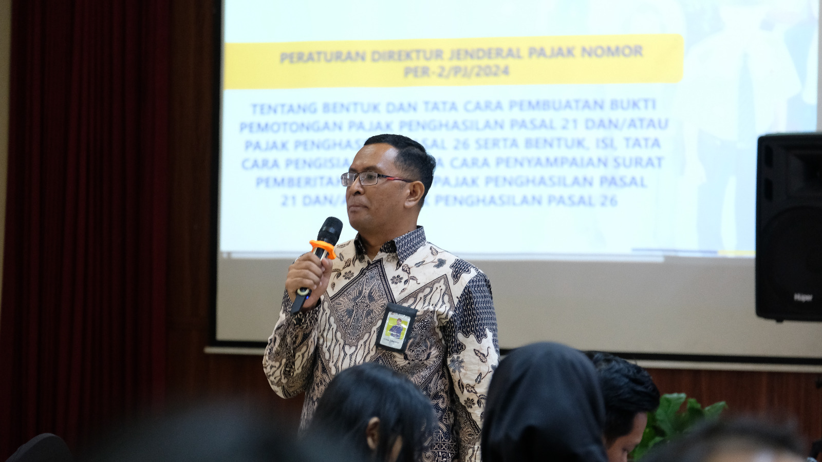 Kegiatan ini diadakan sebagai tindak lanjut atas Peraturan Dirjen Pajak PER-2/PJ/2024 yang membahas tentang Bentuk dan Tata Cara Permbuatan Bukti Pemotongan Pajak Penghasilan Pasal 21 dan/atau Pajak Penghasilan Pasal 26 serta Bentuk, Isi, Tata Cara Pengisian, dan Tata Cara Penyampaian Surat Pemberitahuan Masa Pajak Penghasilan Pasal 21 dan/atau Pajak Penghasilan Pasal 26, yang dirilis oleh DJP pada 19 Januari 2024. Pada intinya, peraturan ini membahas ketentuan terbaru dalam penerbitan bukti pemotongan Pajak Penghasilan (PPh) 21/26 serta pelaporan Surat Pemberitahuan (SPT) Masa PPh 21/26.
