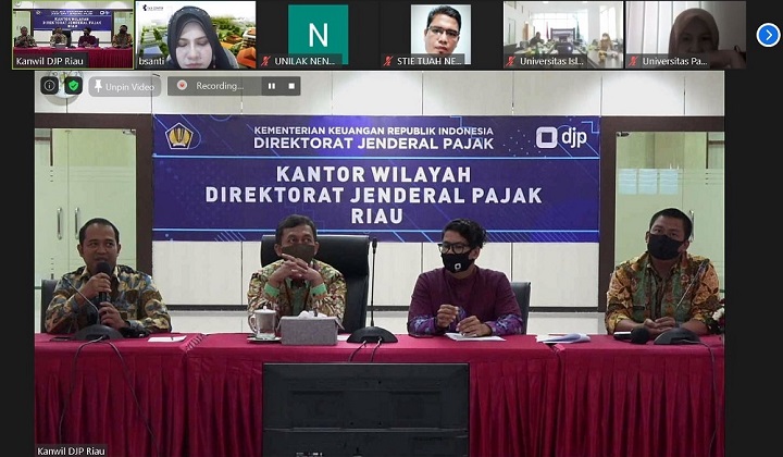 Menyesuaikan dengan kondisi pandemi saat ini, 36 Perguruan Tinggi di Wilayah Provinsi Riau mengiktui Bimbingan Teknis (Bimtek) Inklusi Kesadaran Pajak yang diselenggarakan oleh Kantor Wilayah DJP Riau melalui aplikasi konferensi video di Kota Pekanbaru, Riau (Selasa, 25/8).