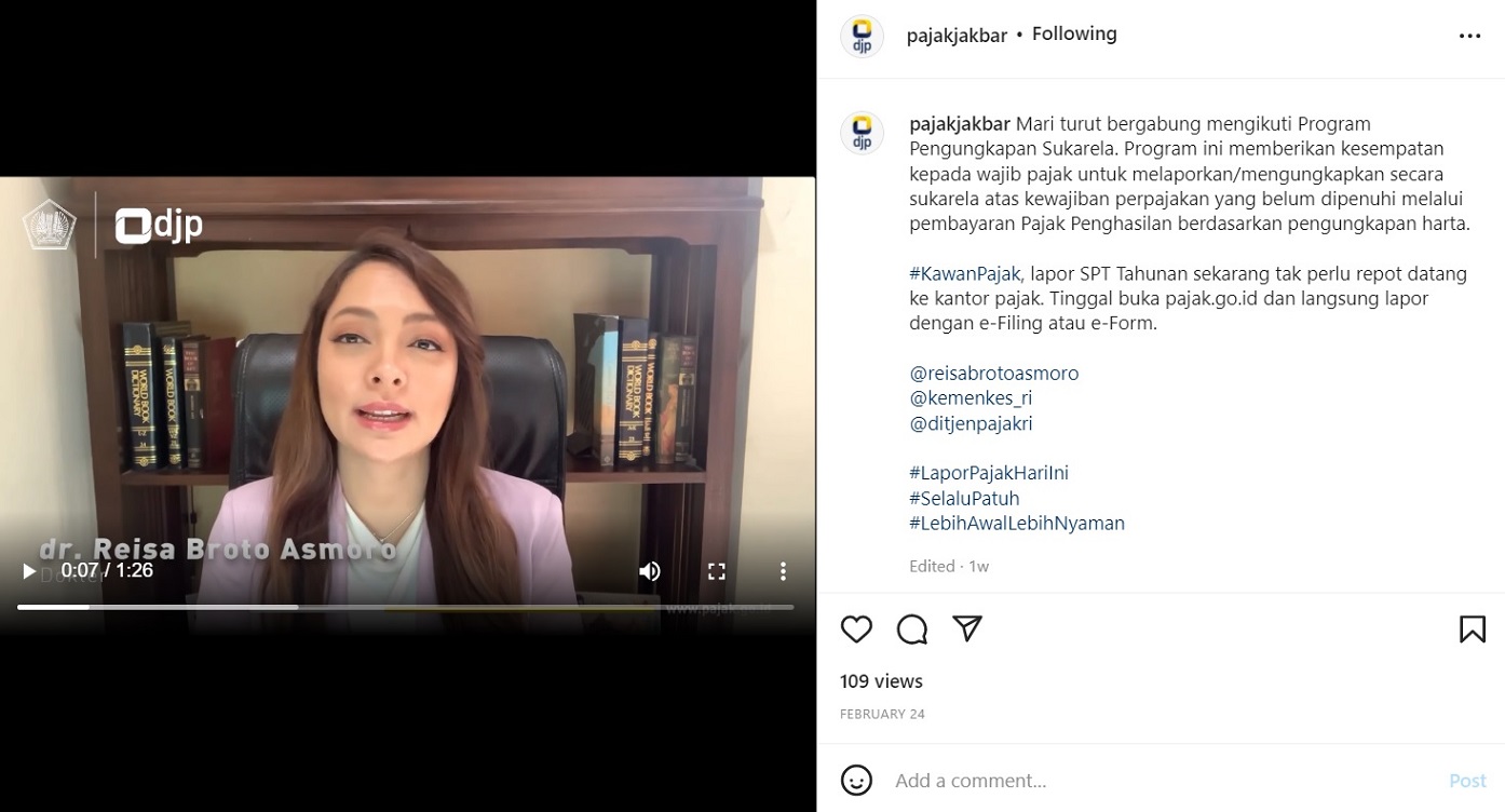 Dokter Reisa Broto Asmoro, salah satu Juru Bicara Satuan Tugas Penanganan Covid 19, menyampaikan ajakan kepada masyarakat untuk memanfaatkan Program Pengungkapan Sukarela melalui rekaman vidio di kediamannya di Jakarta (Kamis, 24/02). Tayangan vidio tersebut dapat disaksikan di akun jejaring sosial Kantor Wilayah Direktorat Jenderal Pajak Jakarta Barat.