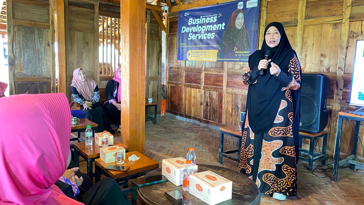 Pengusata katering Kediri Lila Wirawati menyampaikan materi kewirausahaan dalam kegiatan Business Development Services (BDS) di Pawon Mak Gomah Banjarmlati, Kabupaten Kediri, Jawa Timur (Selasa, 15/10). BDS diinisiasi oleh Kantor Pelayanan Pajak (KPP) Pratama Kediri sebagai upaya untuk meningkatkan daya saing Usaha Mikro, Kecil dan Menengah (UMKM). Materi kewirausahaan tersebut ia sampaikan kepada lima puluh wajib pajak pengusaha kuliner yang tergabung dalam Ikatan Pengusaha Muslimah Indonesia (IPEMI).