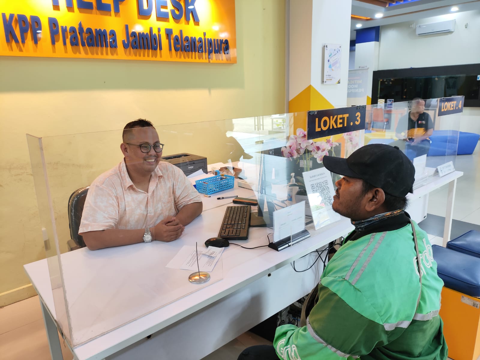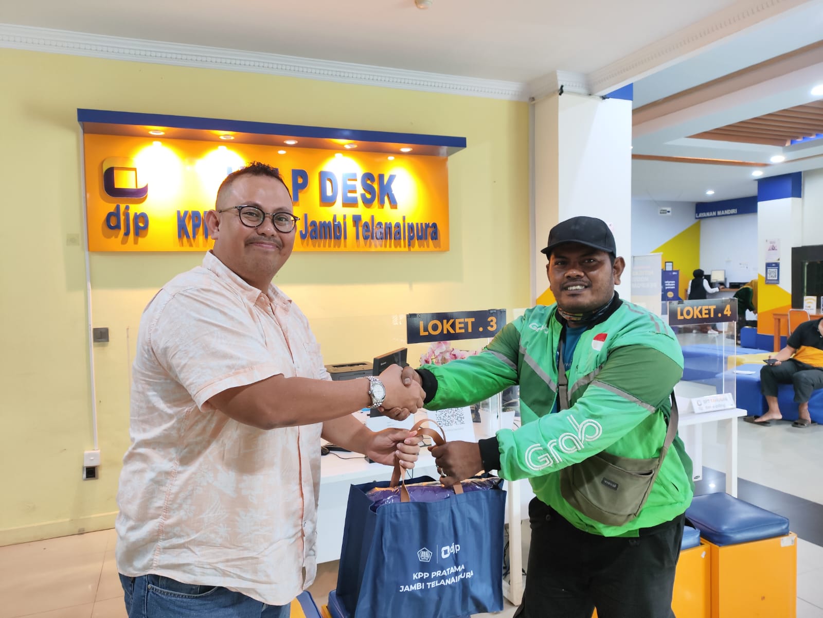 Kantor Pelayanan Pajak (KPP) Pratama Jambi Telanaipura melalui Penyuluh Pajak Didi Perdana Kesuma, memberikan apresiasi kepada Antoni, seorang wajib pajak yang berprofesi sebagai pengemudi ojek online. Antoni menjadi wajib pajak pertama yang melaporkan Surat Pemberitahuan (SPT) Tahunan Orang Pribadi Tahun Pajak 2024 di KPP Pratama Jambi Telanaipura pada hari pertama kerja tahun 2024 (Kamis, 2/1).