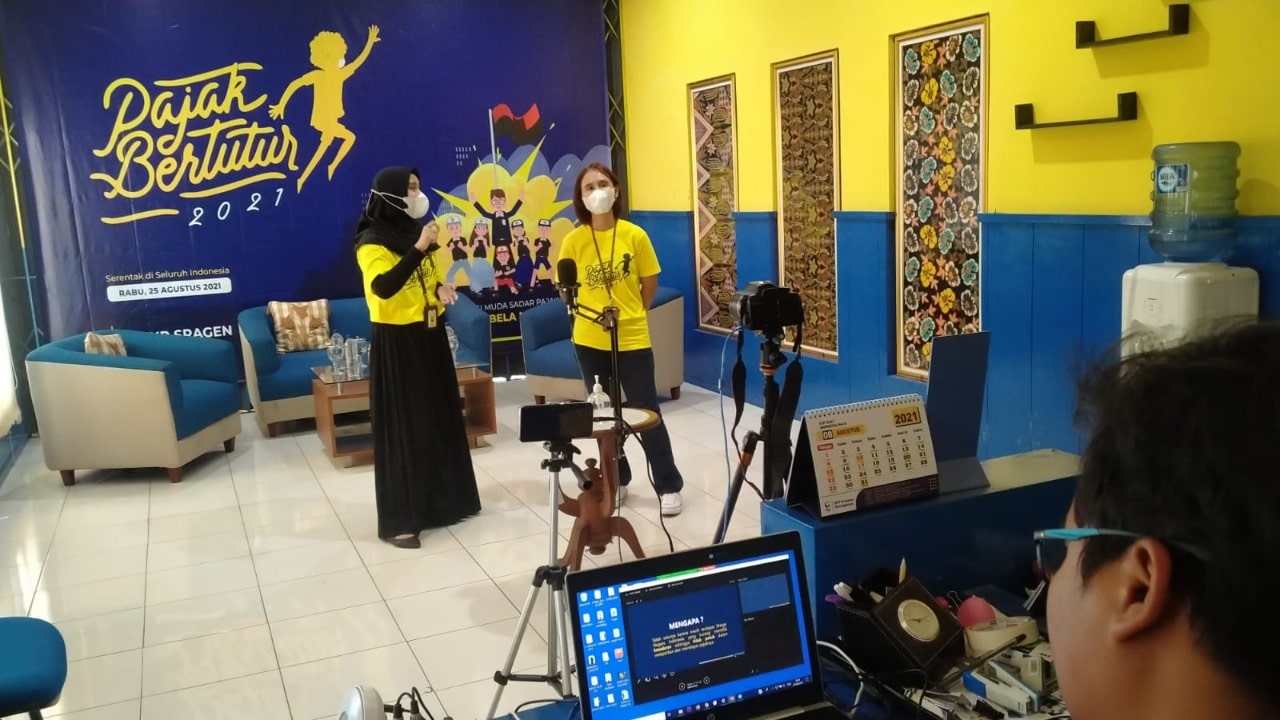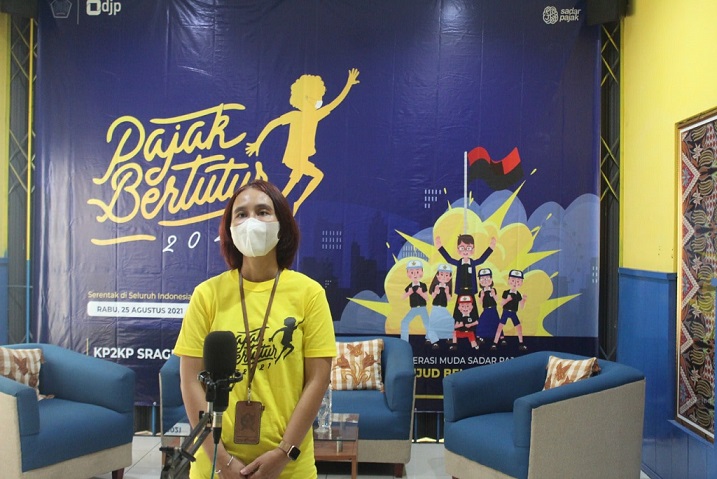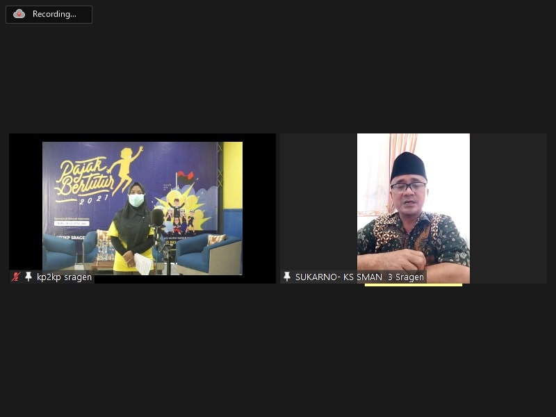 Kantor Pelayanan, Penyuluhan, dan Konsultasi Perpajakan (KP2KP) Sragen mengadakan kegiatan Pajak Bertutur di Sragen (Rabu, 25/8). Pajak bertutur dengan tema “Generasi Muda Sadar Pajak, Wujud Bela Negara” diadakan secara daring melalui Zoom Meeting.