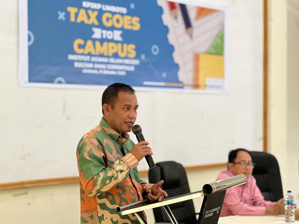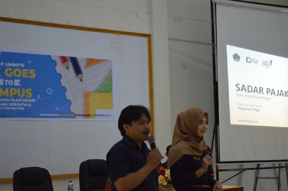 Kantor Pelayanan, Penyuluhan, dan Konsultasi Perpajakan (KP2KP) Limboto memulai kegiatan Tax Goes to Campus (TGTC) tahun 2023 di Institut Agama Islam Negeri (IAIN) Sultan Amai Gorontalo. Kegiatan ini dilaksanakan di Aula Fakultas Ekonomi dan Bisnis Islam (FEBI) IAIN Gorontalo (Rabu, 11/10).
