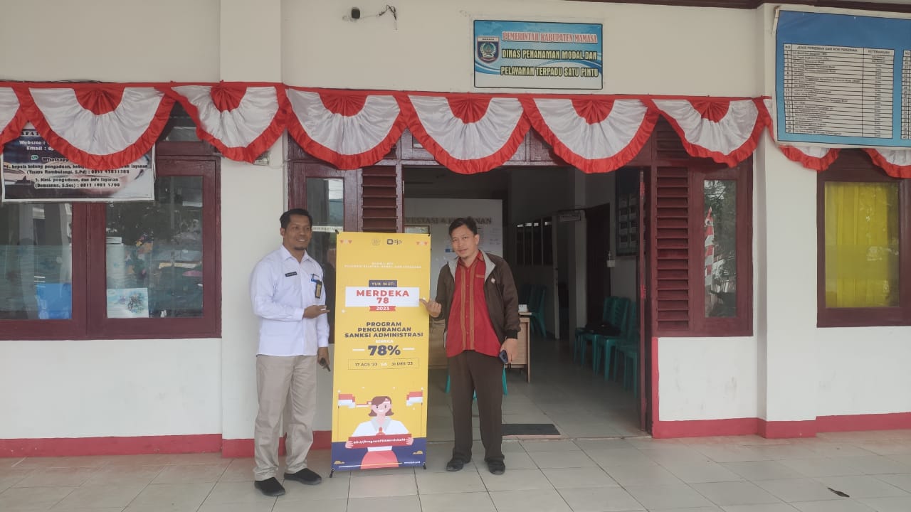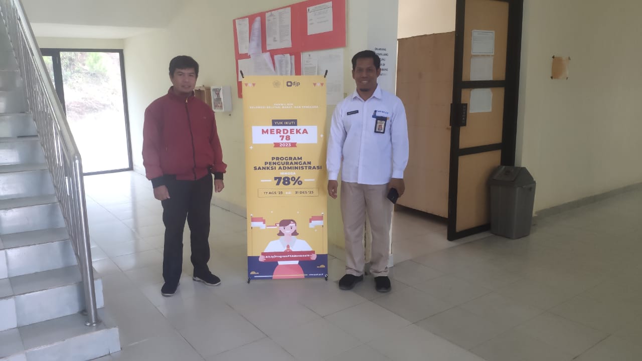 Kantor Pelayanan, Penyuluhan, dan Konsultasi Perpajakan (KP2KP) Mamasa gencarkan publikasi Program Pengurangan Sanksi Administrasi (PSA) Merdeka 78 dari Kantor Wilayah Direktorat Jenderal Pajak Sulawesi Selatan, Barat, dan Tenggara (Kanwil DJP Sulselbartra), dengan menempatkan banner di beberapa titik layanan Pemerintahan Daerah Kabupaten Mamasa, Sulawesi Barat (Kamis, 24/8).