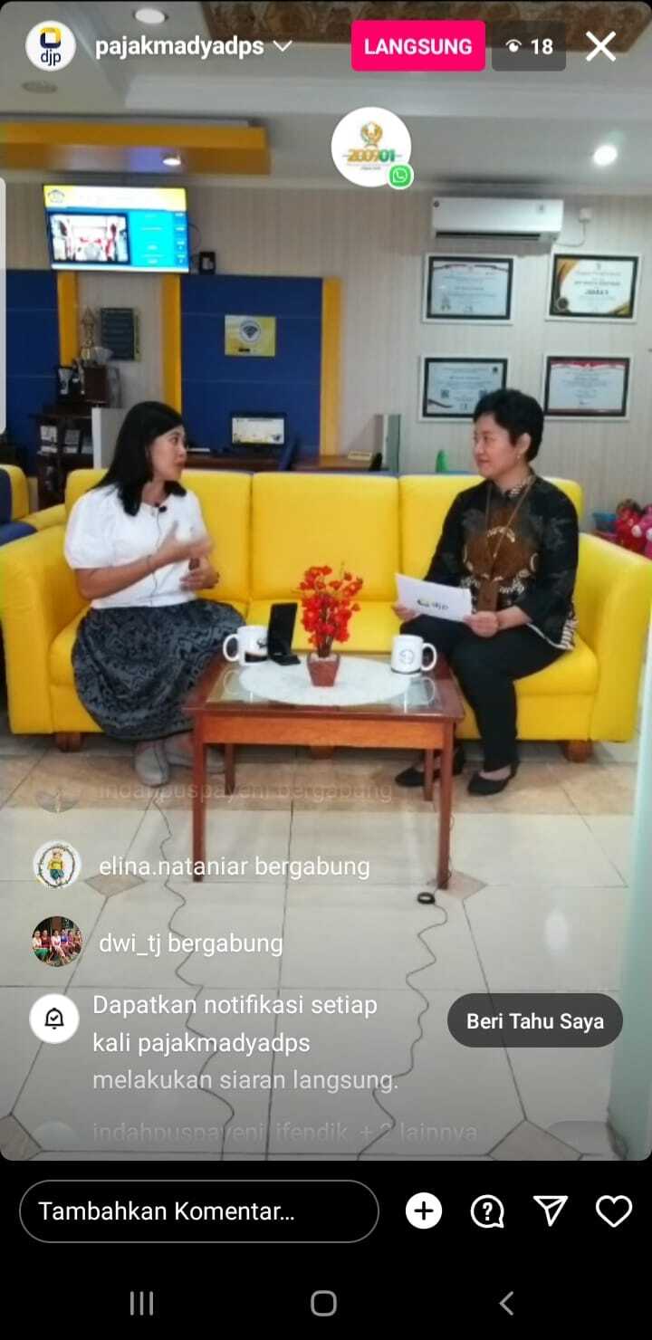 Dalam rangka mendukung reformasi pajak, Kantor Pelayanan Pajak (KPP) Madya Denpasar menggelar edukasi perpajakan terkait proses bisnis registrasi melalui fitur siaran langsung pada aplikasi Instagram di ruang helpdesk KPP Madya Denpasar (Jumat, 17/03).