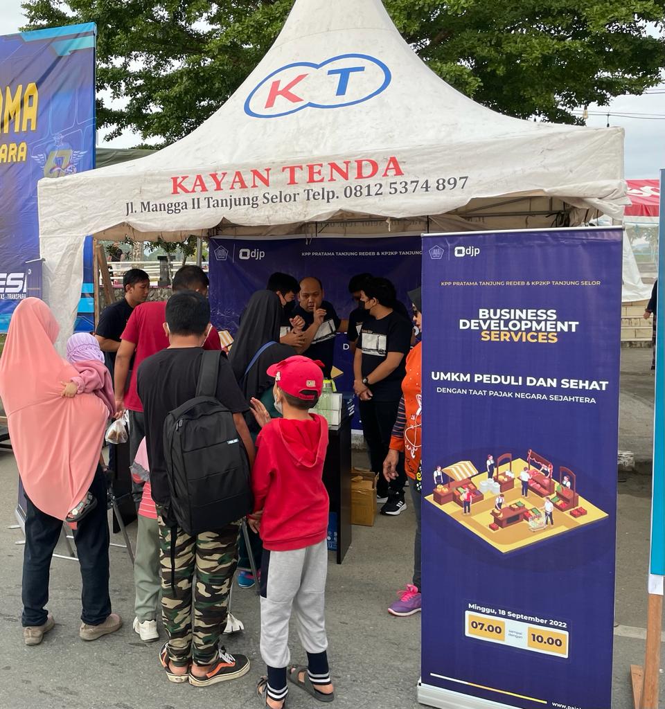 Kantor Pelayanan Pajak (KPP) Pratama Tanjung Redeb bersinergi dengan Kantor Pelayanan, Penyuluhan, dan Konsultasi Perpajakan (KP2KP) Tanjung Selor mengadakan kegiatan Business Development Services (BDS) Usaha Mikro Kecil dan Menengah (UMKM) bertema “UMKM Peduli dan Sehat Dengan Taat Pajak Negara Sejahtera” yang dilaksanakan di Tepian Sungai Kayan, Kabupaten Bulungan (Minggu, 18/9).