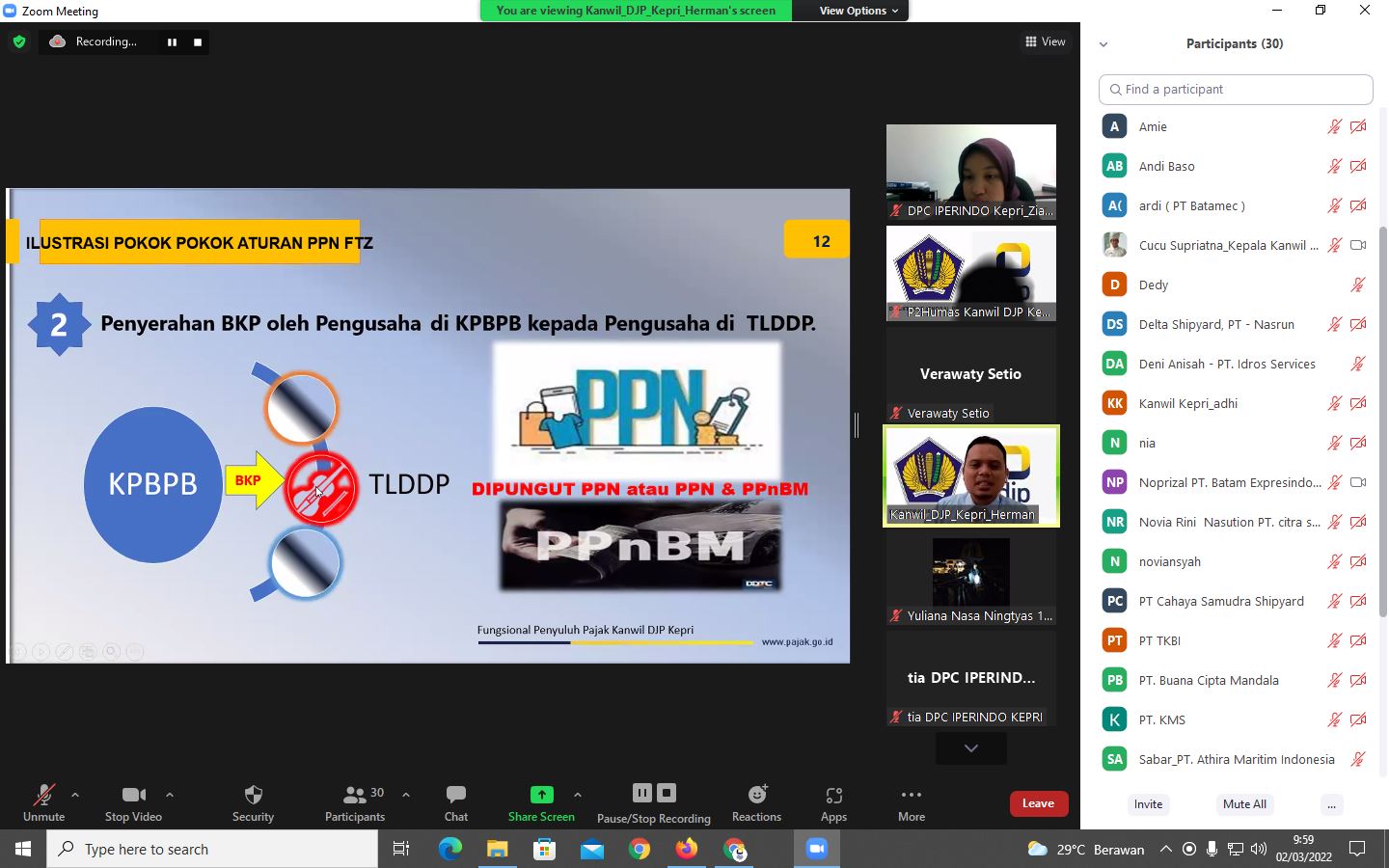 Kantor Wilayah Direktorat Jenderal Pajak Kepulauan Riau (Kanwil DJP Kepri) menjadi narasumber pada sosialisasi secara daring yang diselenggarakan oleh Ikatan Perusahaan Industri Kapal dan Lepas Pantai Indonesia (Iperindo) Cabang Kepulauan Riau (Rabu, 2/3).