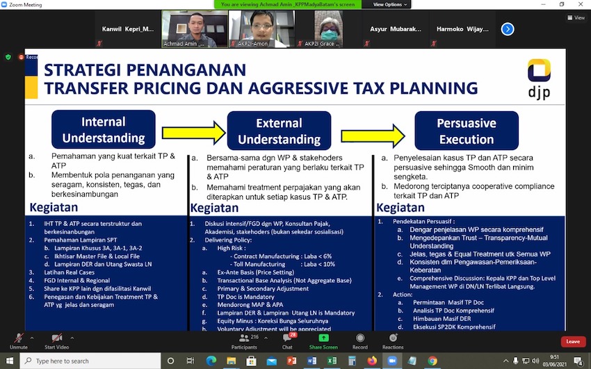 “DJP bersama-sama wajib pajak dan para pemangku kepentingan perlu memahami peraturan yang berlaku terkait TP dan memahami perlakukan perpajakan yang akan diterapkan untuk setiap kasus TP. Penyelesaian kasus TP diutamakan secara persuasif sehingga minim sengketa dan akan mendorong peningkatkan kepatuhan sukarela,” ucap Achmad Amin pada saat mengawali paparan.