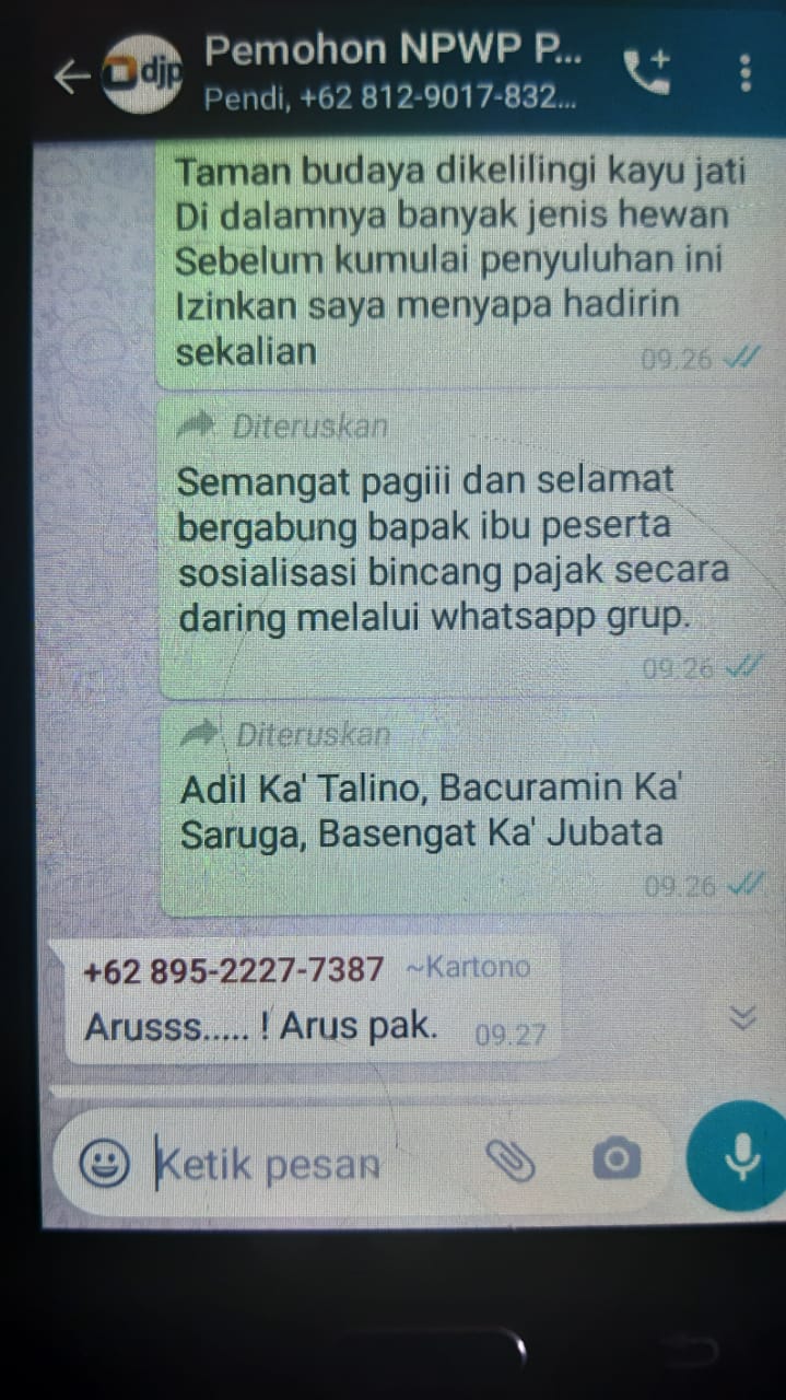 Kegiatan yang diikuti oleh 30 peserta ini tampak antusias dan semangat dalam mengikuti kelas pajak ini. Kegiatan edukasi ini diisi dengan pemaparan materi, bimbingan pembuatan NPWP PAUD dan sesi tanya jawab antara peserta dengan petugas. "Saya akhirnya bisa dan tau cara membuat NPWP PAUD saya walaupun KP2KP Ngabang tutup pelayanan tatap muka," ujar Kartono, salah satu peserta kegiatan melalui pesan Whatsapp.