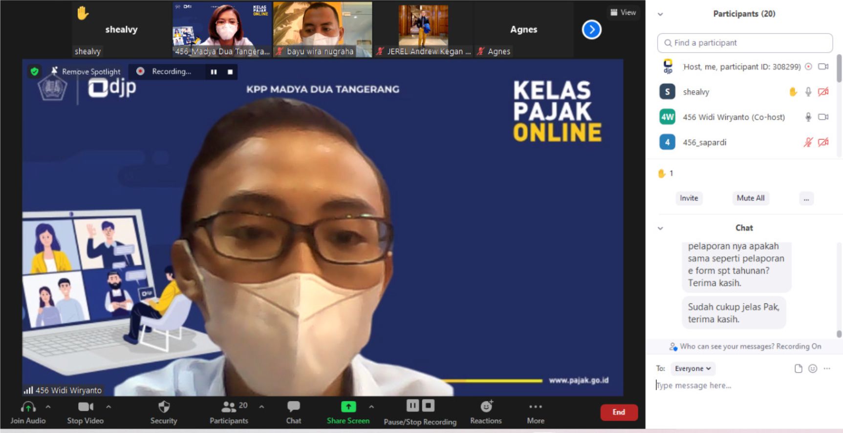 Kegiatan dimulai pukul 09.00 WIB sampai dengan 11.00 WIB dan diikuti oleh 15 wajib pajak yang telah melakukan registrasi melalui tautan yang telah disediakan. Fungsional Penyuluh KPP Madya Dua Tangerang Widi Wiryanto dan Yeni Fransisca Widyaningsih bertindak sebagai pembawa acara dan pemateri.