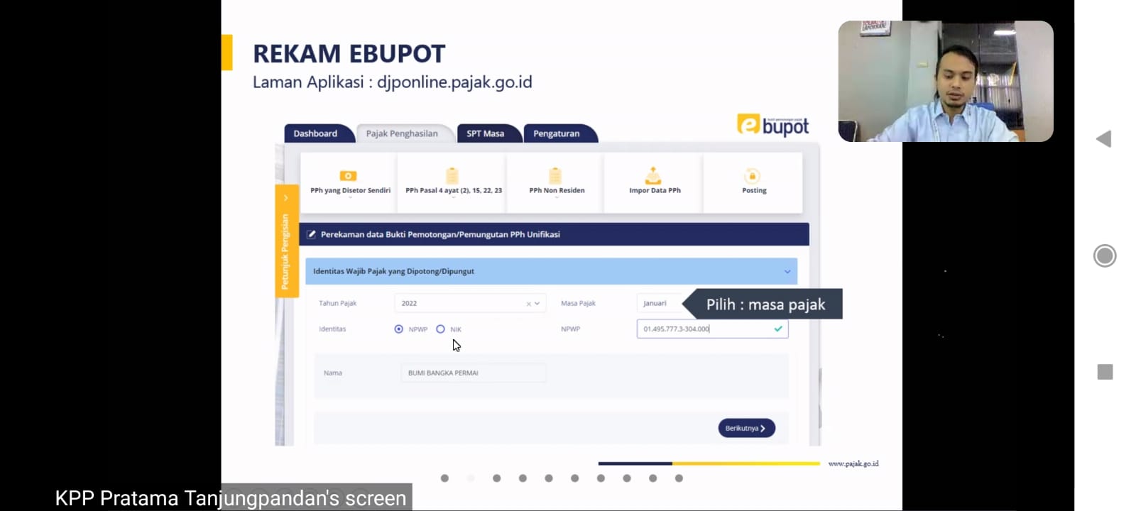 Kantor Pelayanan Pajak (KPP) Pratama Tanjung Pandan melaksanakan Edukasi dan Bimbingan Teknis SPT Masa Unifikasi untuk Badan secara daring di Belitung (Rabu, 18/05). Edukasi ini merupakan salah satu bentuk sosialisasi penggunaan SPT Masa Unifikasi yang wajib digunakan mulai masa April 2022.