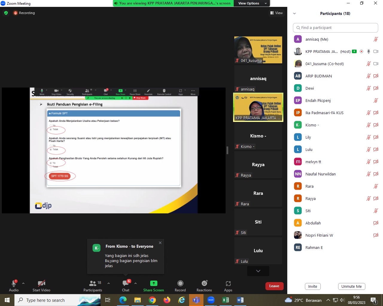 Kantor Pelayanan Pajak (KPP) Pratama Jakarta Penjaringan menyelenggarakan kelas pajak secara daring mengenai tata cara pelaporan Surat Pemberitahuan (SPT) Tahunan Pajak Penghasilan Orang Pribadi secara online (Rabu, 8/3). Kelas pajak dilaksanakan pukul 09.00 sampai 11.00 WIB melalui aplikasi Zoom Meeting yang dihadiri oleh 14 Wajib Pajak Orang Pribadi Non Pengusaha Kena Pajak (PKP).