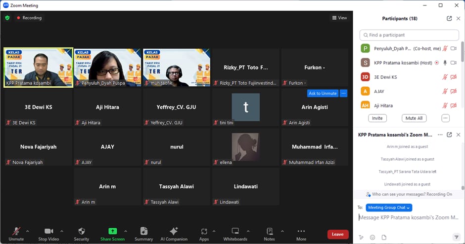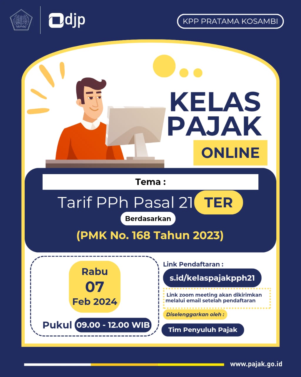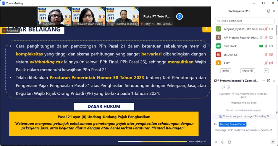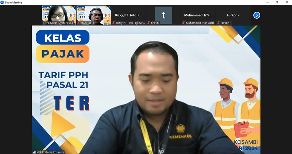 Kantor Pelayanan Pajak (KPP) Pratama Kosambi menggelar Kelas Pajak Online untuk menyampaikan pemberlakuan Tarif Pajak Penghasilan (PPh) Pasal 21 Tarif Efektif Rata-Rata (TER) berdasarkan Peraturan Menteri Keuangan (PMK) Nomor 168 Tahun 2023 tentang Petunjuk Pelaksanaan Pemotongan Pajak Atas Penghasilan Sehubungan Dengan Pekerjaan, Jasa, Atau Kegiatan Orang Pribadi. Registrasi dibuka untuk umum dan kelas pajak online ini dapat diikuti melalui aplikasi zoom meeting. Kelas pajak online ini diikuti oleh wajib pajak khususnya para pemberi kerja dan bendahara pemerintah di lingkungan wilayah kerja KPP Pratama Kosambi (Rabu, 7/2).