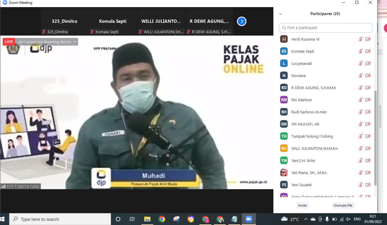 Kantor Pelayanan Pajak (KPP) Pratama Natar mengundang para Notaris/ Pejabat Pembuat Akta Tanah (PPAT) yang berasal dari wilayah Pesawaran, Pringsewu, dan Tanggamus untuk mengikuti kelas pajak secara daring mengenai panduan penggunaan aplikasi e-PHTB di Ruang Penyuluhan KPP Natar, Lampung Selatan (Kamis, 1/9).