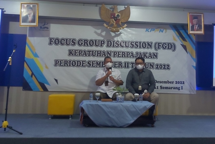 Kantor Pelayanan Perbendaharaan Negara (KPPN) Tipe A1 Semarang I mengundang Kantor Pelayanan Pajak (KPP) Pratama Semarang Timur menjadi narasumber pada acara Focus Group Discussion (FGD) Kepatuhan Perpajakan bagi Bendahara Satuan Kerja (Satker) periode semester II tahun 2022 di Semarang (Kamis, 1/12).