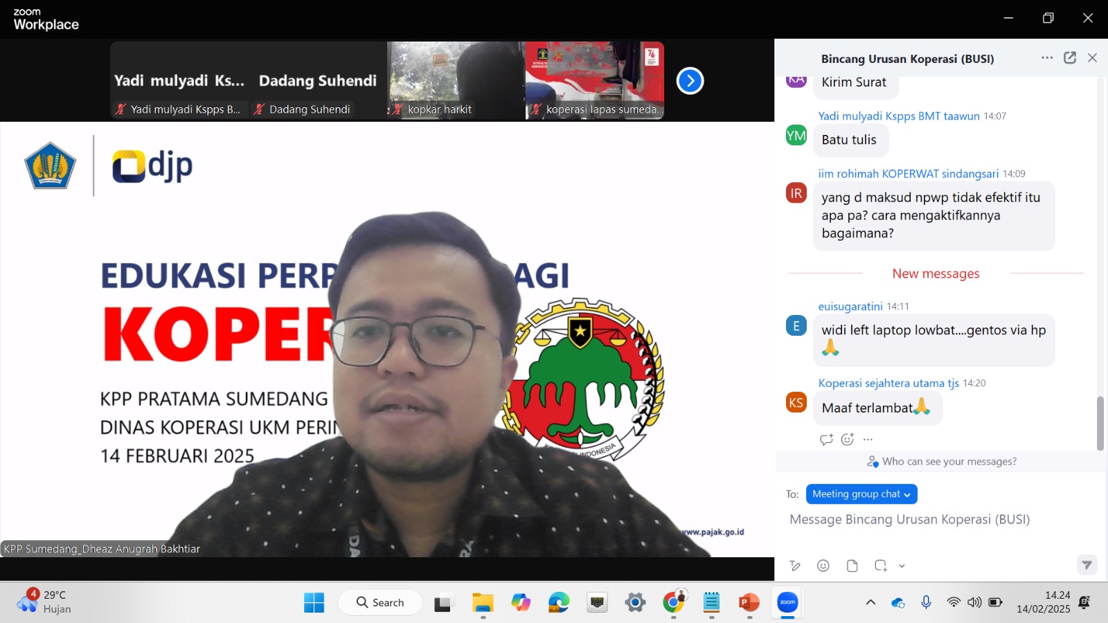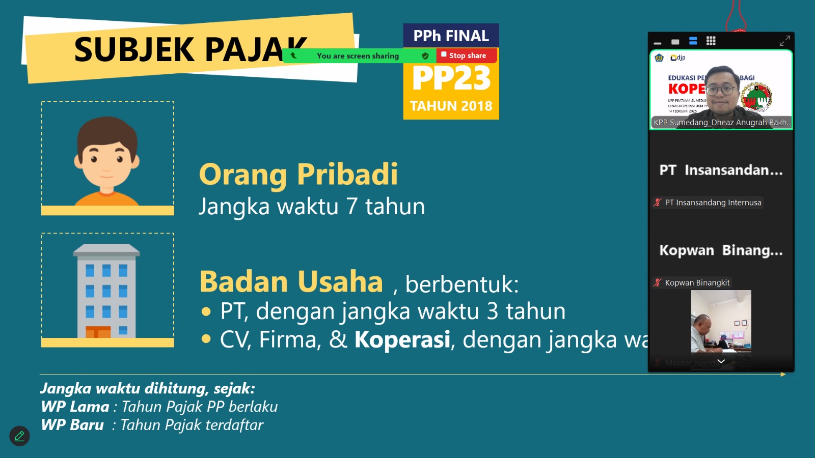 Penyuluh Pajak Kantor Pelayanan Pajak (KPP) Pratama Sumedang, Dheaz Anugrah Bakhtiar, memberikan sosialisasi tentang kewajiban perpajakan untuk Wajib Pajak Badan koperasi secara daring melalui Zoom Meeting di Kabupaten Sumedang (Jumat, 14/2). Sebanyak 22 koperasi di Kabupaten Sumedang mengikuti kegiatan tersebut.
