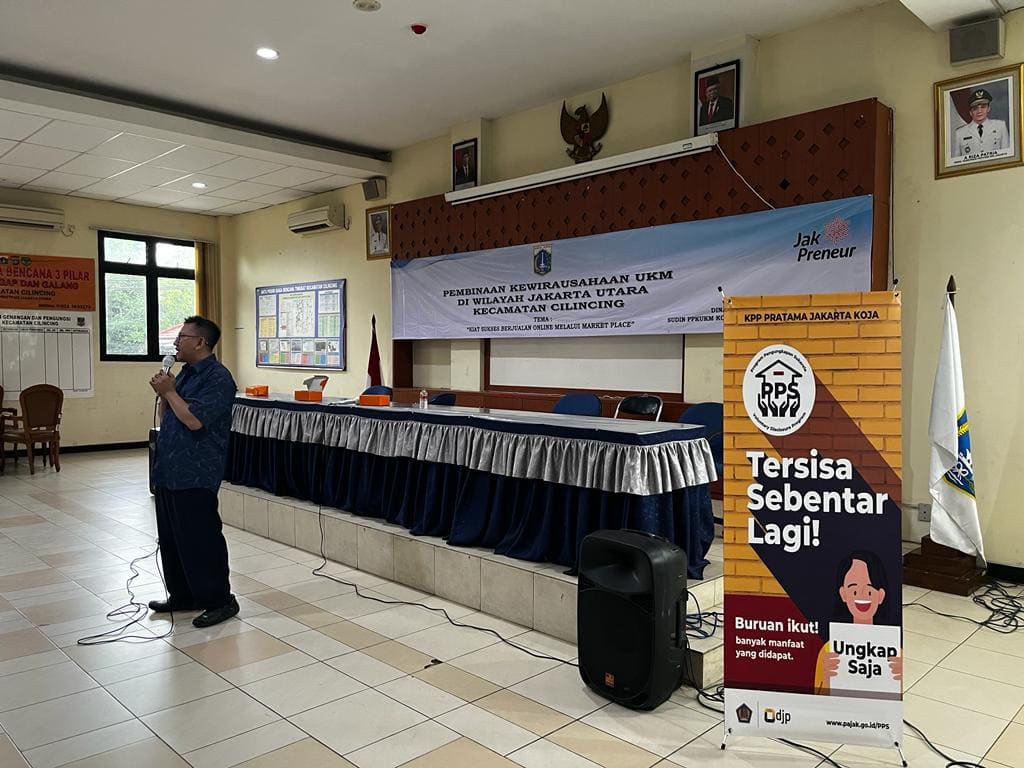 Kantor Pelayanan Pajak (KPP) Pratama Jakarta Koja bekerja sama dengan Suku Dinas (Sudin) Perindustrian, Perdagangan, Koperasi, Usaha Kecil dan Menengah Kota Administrasi Jakarta Utara mengadakan sosialisasi yang bertemakan 'Peningkatan pengetahuan dan pemahaman pengusaha UMKM Jakpreneur mengenai kewajiban perpajakan' (Kamis, 16/6). Kegiatan ini diselenggarakan secara tatap muka di Ruang Pola Kantor Kecamatan Cilincing, Jakarta Utara.