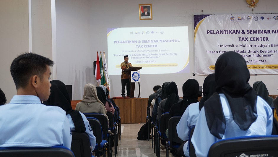 Sekitar 132 orang peserta yang terdiri dari dosen, pengurus tax center, dan mahasiswa Universitas Muhammadiyah (UM) Bandung dan beberapa universitas lainnya mengikuti Seminar Nasional Tax Center Universitas Muhammadiyah Bandung yang mengangkat tema “Peran Generasi Muda untuk Revitalisasi Performa Perpajakan Indonesia” di auditorium K.H Ahmad Dahlan (UM) Bandung, Jalan Soekarno Hatta No.752 Kota Bandung (Selasa, 11/7).