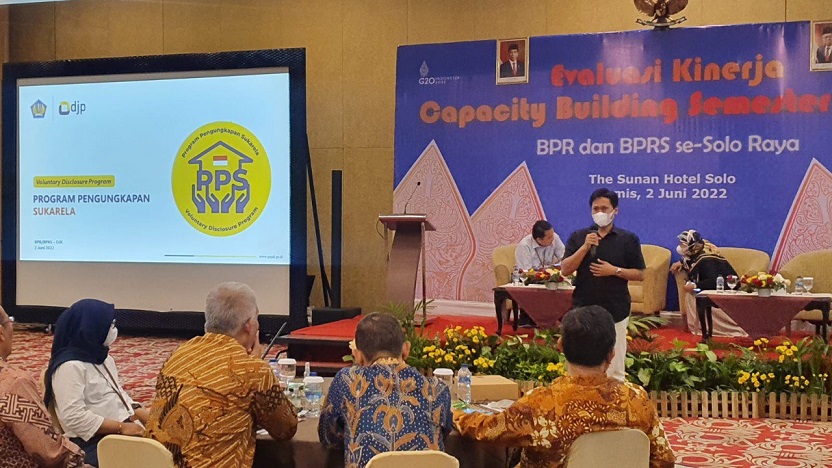 Bekerja sama dengan Otoritas Jasa Keuangan (OJK) Solo, Kantor Wilayah (Kanwil) DJP Jawa Tengah II menjadi narasumber sosialisasi Program Pengungkapan Sukarela (PPS) di Surakarta (Kamis, 2/6). Acara yang digelar di Hotel Sunan dihadiri oleh 71 peserta berbarengan dengan kegiatan Evaluasi Kinerja dan Capacity Building Semester I 2022 BPR dan BPRS di Solo Raya.