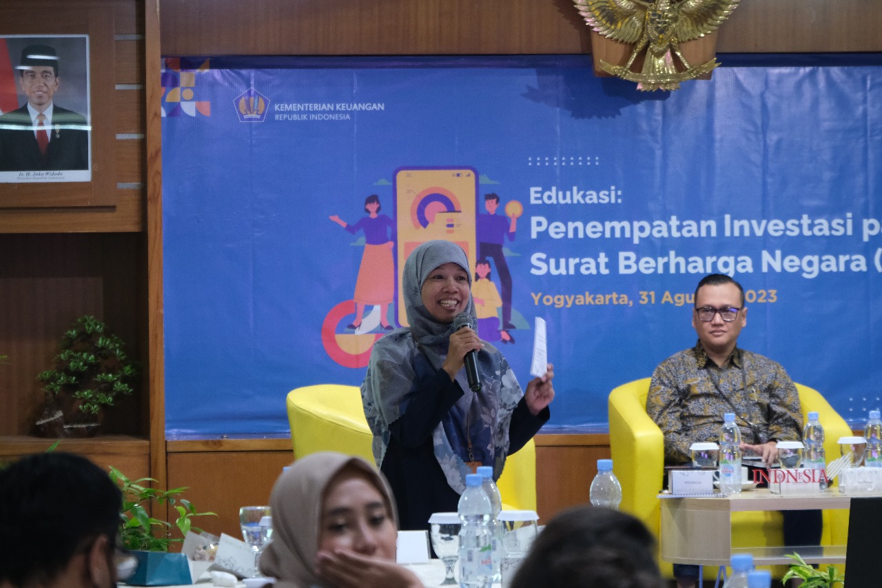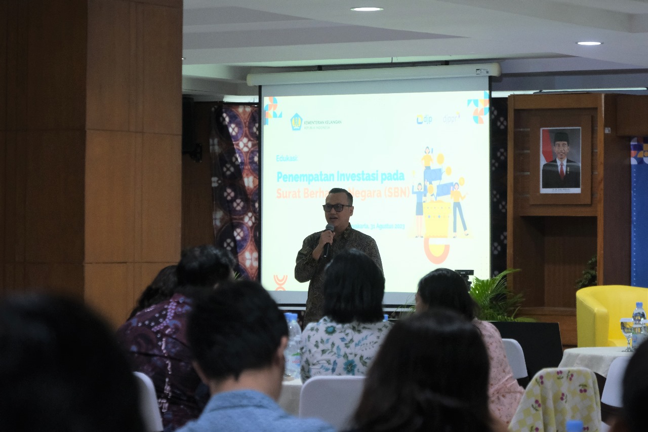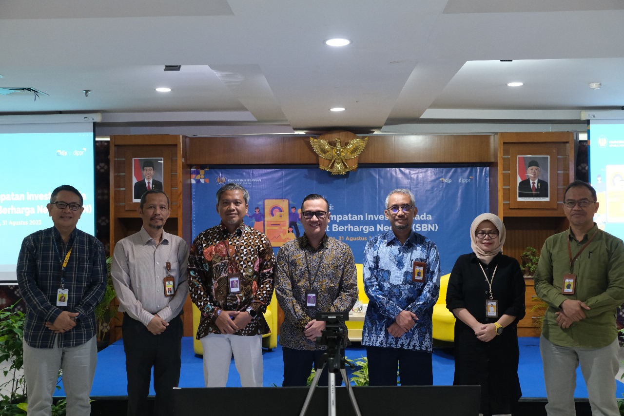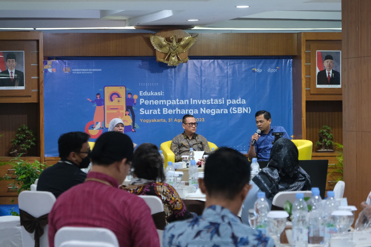 Kantor Wilayah Direktorat Jenderal Pajak (Kanwil DJP) Daerah Istimewa Yogyakarta (DIY) bekerja sama dengan Direktorat Jenderal Pengelolaan Pembiayaan dan Risiko (DJPPR) Kementerian Keuangan menyelengarakan sosialisasi penempatan investasi pada instrument Surat Berharga Negara (SBN) di Aula Yudhistira Lantai 7 Gedung Kanwil DJP DIY, Jalan Padjajaran (Ringroad Utara) No. 10, Kecamatan Depok, Kabupaten Sleman, D.I. Yogyakarta (Kamis, 31/8).
