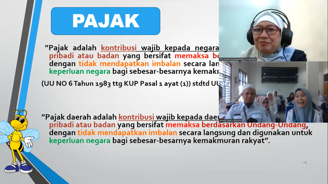 Kantor Wilayah DJP Sumatera Barat dan Jambi mengadakan Bimbingan Teknis Pengelolaan Pajak Daerah melalui daring Zoom dengan peserta bimbingan dari Badan Pengelola Pajak dan Retribusi Daerah (BPPRD) Kabupaten Sarolangun (Rabu, 13/3). Bimtek ini merupakan hasil dari perjanjian kerja sama optimalisasi pemungutan pajak pusat dan pajak daerah (PKS OP4D) antara Direktorat Jenderal Pajak, Direktorat Jenderal Perimbangan Keuangan, dan Pemerintah Daerah Kabupaten Sarolangun.