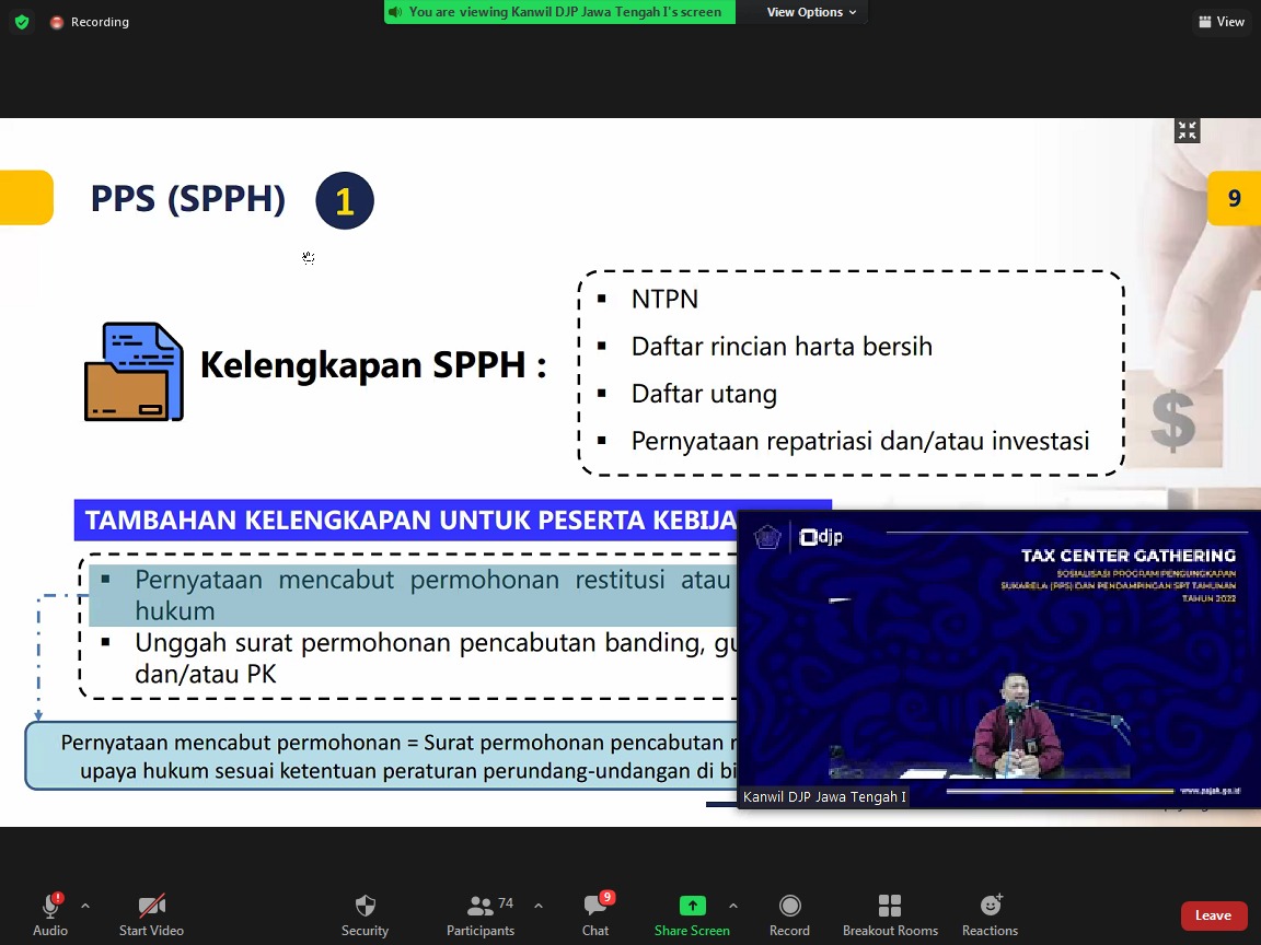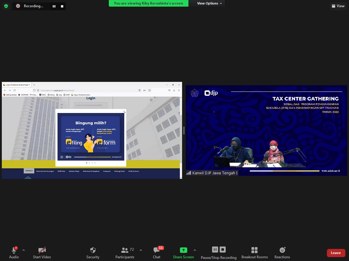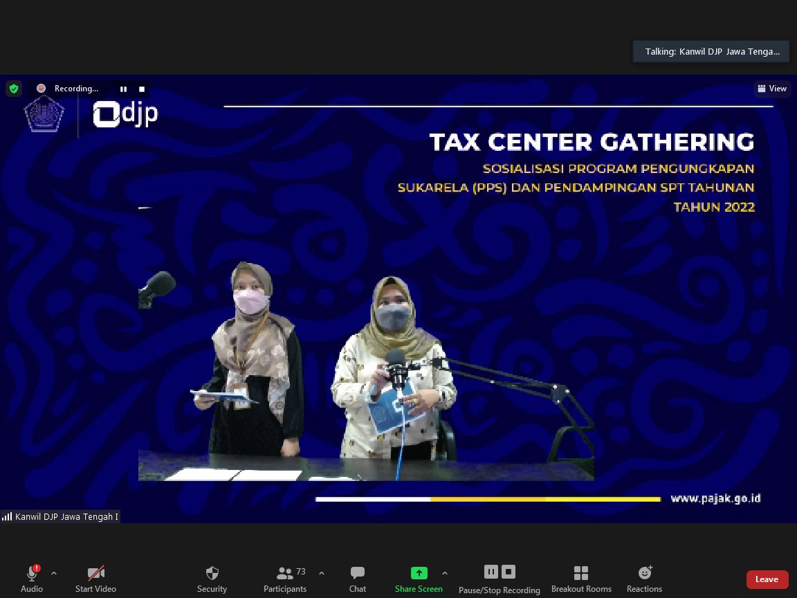 Kantor Wilayah Direktorat Jenderal Pajak (Kanwil DJP) Jawa Tengah I mengadakan acara Riung Tax Center dan Sosialisasi Program Pengungkapan Sukarela serta Pendampingan Pengisian Surat Pemberitahuan (SPT) Tahunan Tahun Pajak 2021 secara daring melalui aplikasi Zoom Cloud Meeting di Semarang (Kamis, 17/3).
